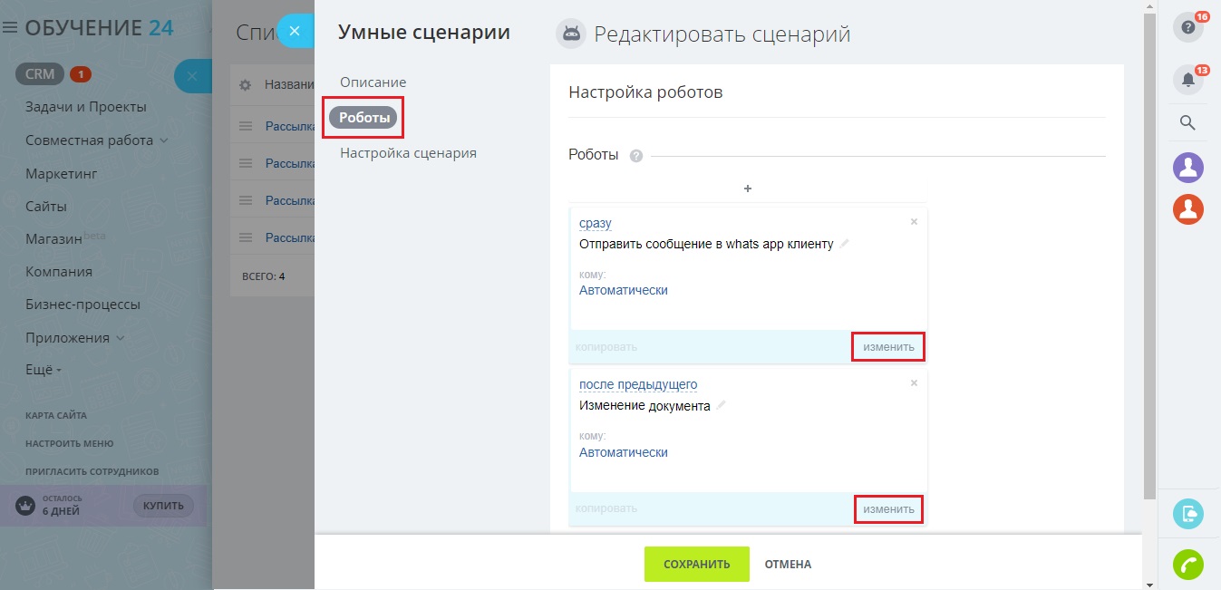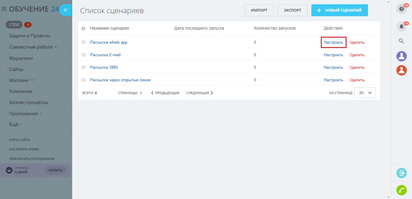 - Выбираете сценарий "Рассылка whats app"