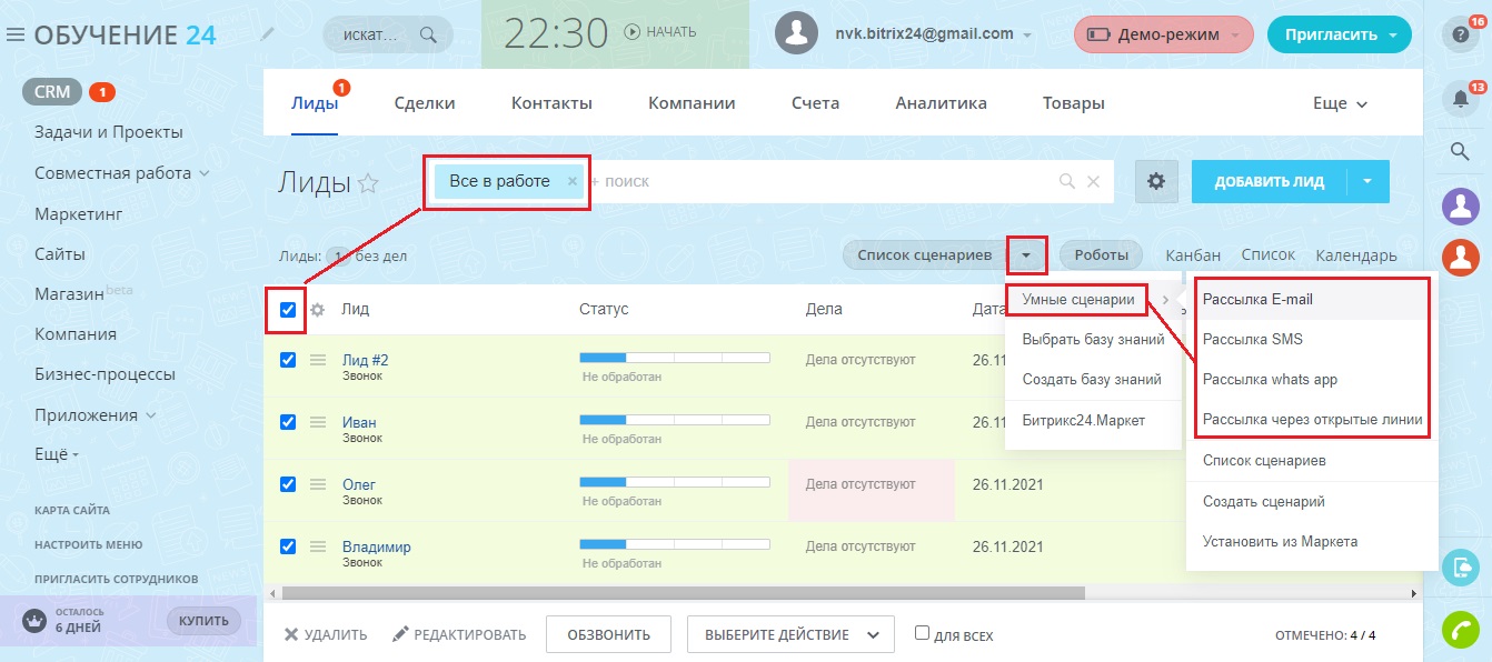 - Открываете список лидов, отфильтровываете и выделяете любое количество