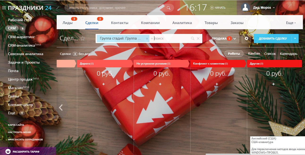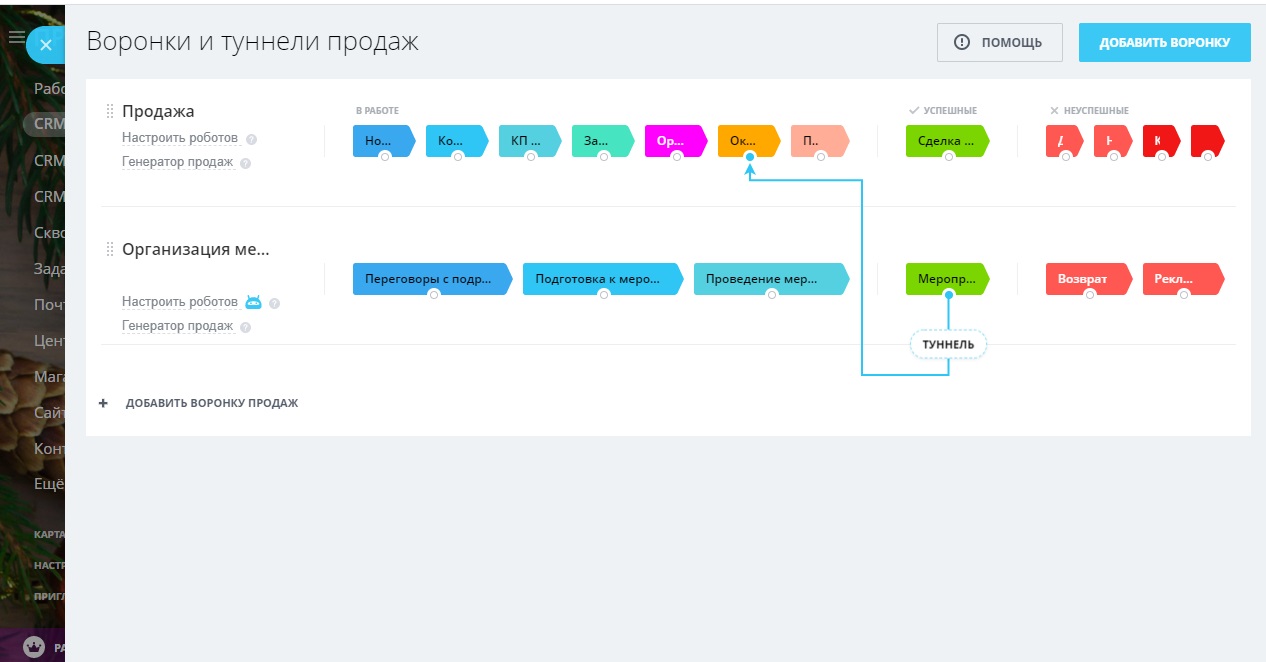 ⁃ заключение сделки - при переходе в эту стадию обязательными к заполнению станут поля Сумма сделки и Дата мероприятия, за неделю и за 3 дня до даты начала мероприятия придёт уведомление о нём.