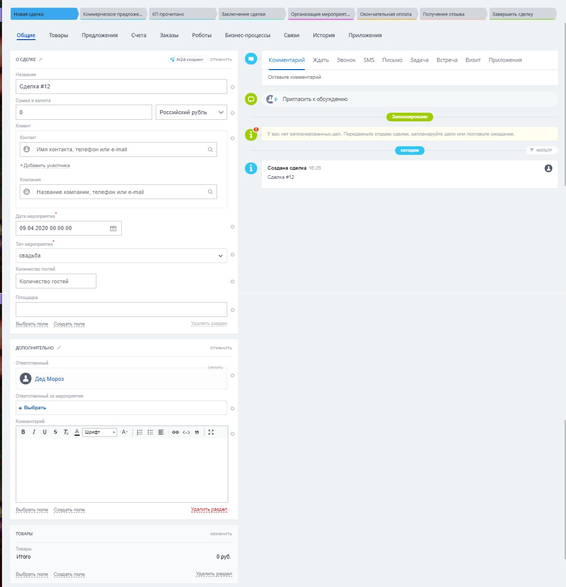Это полная и подробная информация о заказе: участвующие в сделке контакты и компании (кроме клиента, можно ещё привязать внешних подрядчиков), сумма заказа, товары (если необходимо), дата мероприятия, тип мероприятия (корпоратив, свадьба, детский праздник, День Рождения, другое), площадка, коммерческое предложение (файл), смета (файл) и комментарий к сделке.