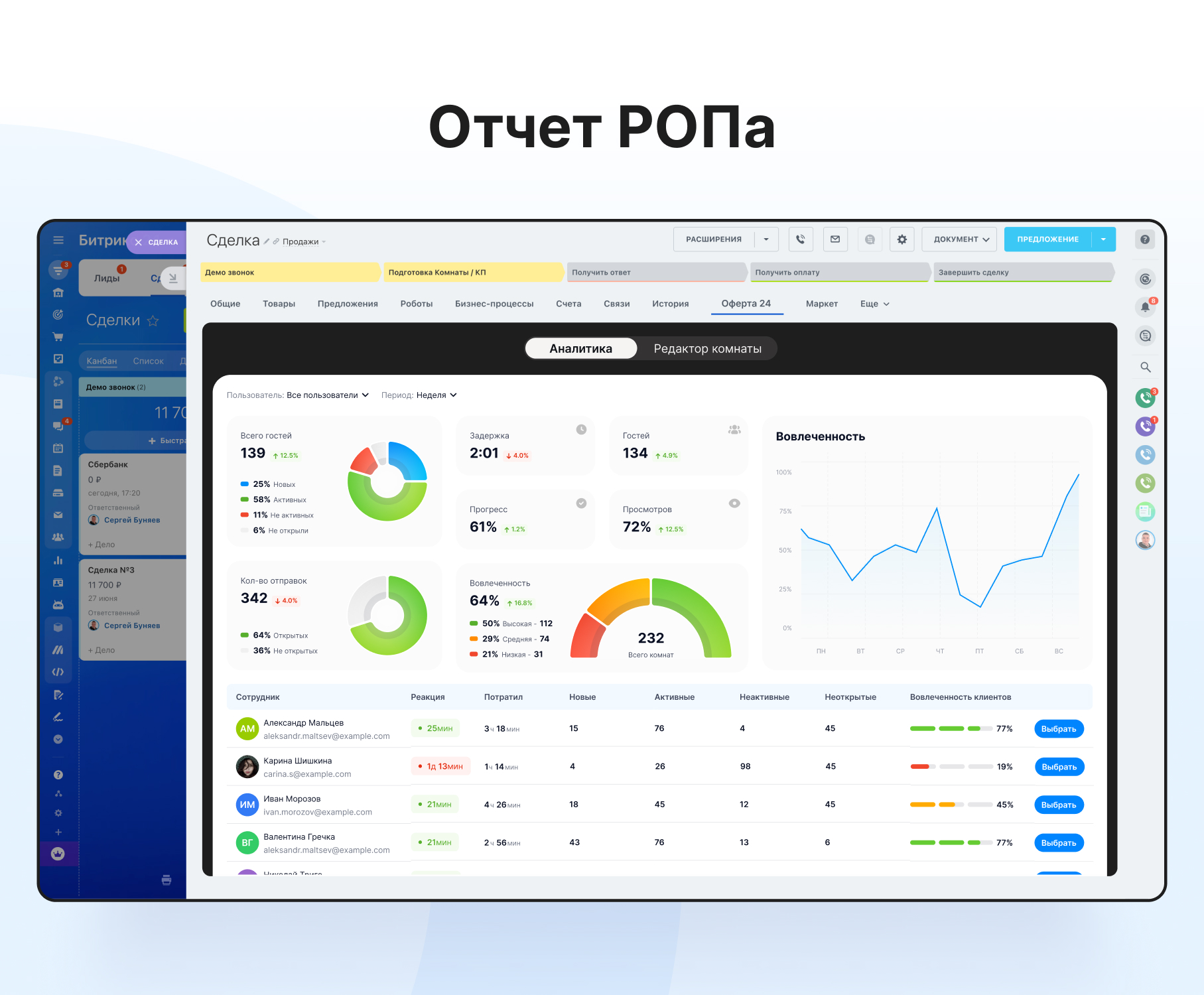 Отчеты для РОП: Генерация подробных отчетов для руководителей отдела продаж, отображающих реальную эффективность работы отдела. Отчеты включают такие показатели, как скорость реакции менеджера на активность клиента, средняя вовлеченность клиентов, часы работы в приложении, а также количество новых, активных, неактивных и неоткрытых комнат.