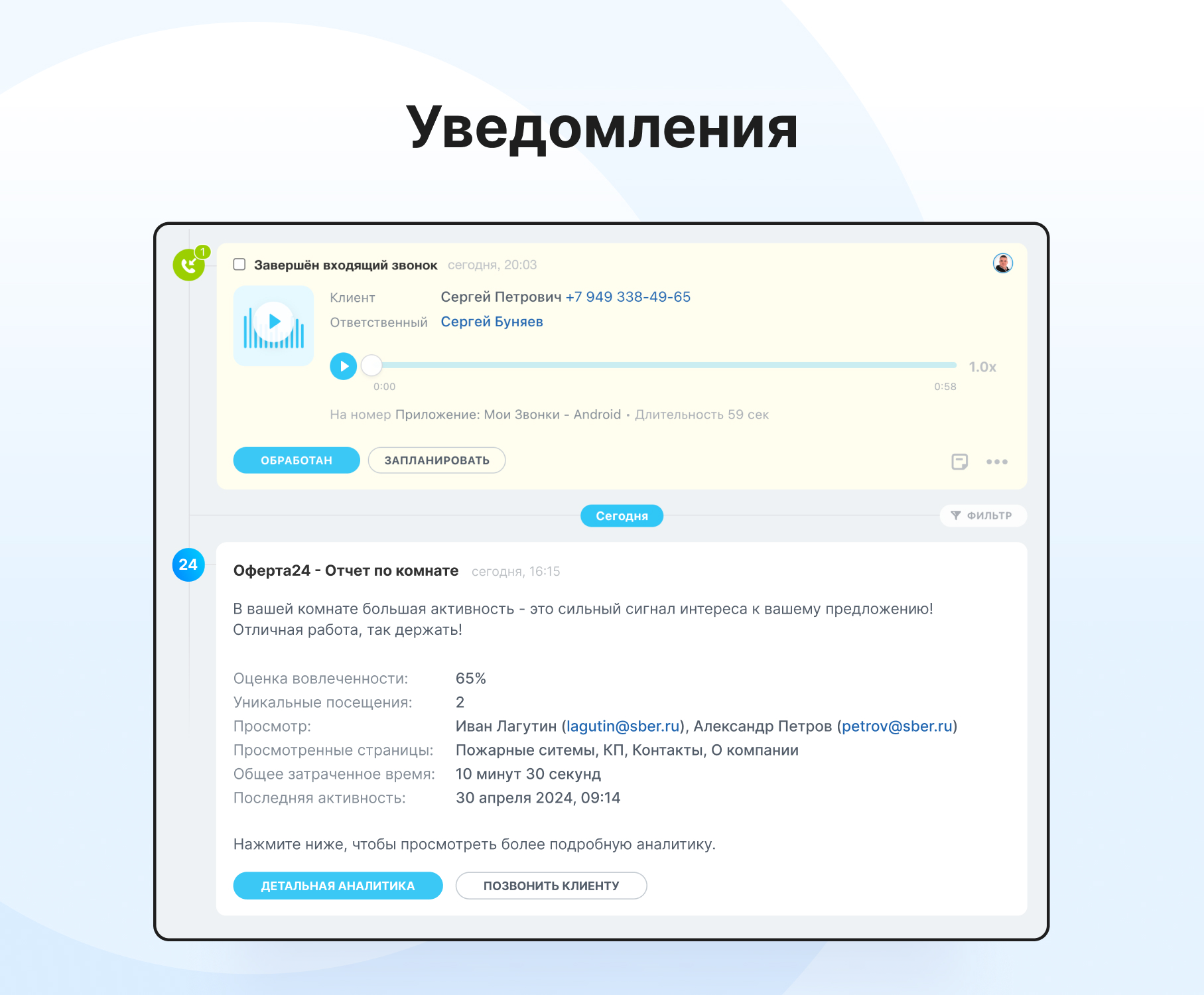 Приложение предоставляет глубокую аналитику взаимодействия клиента с умным КП, помогая менеджерам и директорам своевременно принимать решения и повышать эффективность продаж