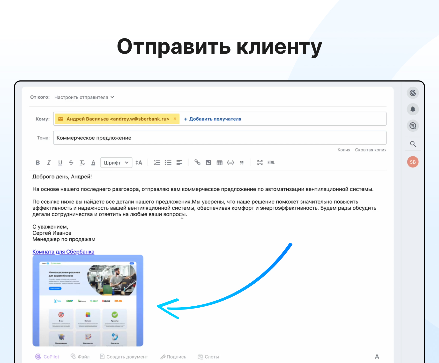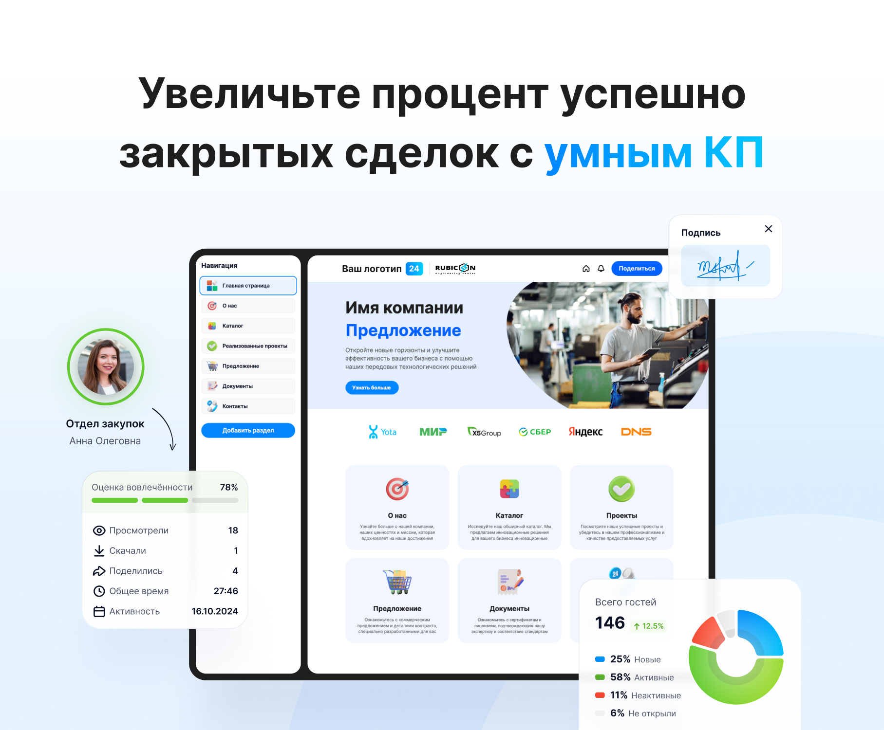 Умное КП — это автоматически сгенерированный микросайт на основе вашего коммерческого предложения, персонализированный под каждого клиента. По сути, это цифровая комната продаж для взаимодействия между продавцом и покупателем. Руководитель отдела продаж может централизованно редактировать шаблоны и отслеживать аналитику по всему отделу.