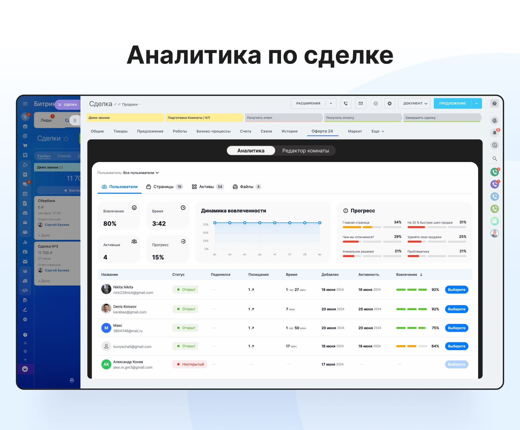 Подробная аналитика: Мы отслеживаем каждое действие клиента и предоставляем информацию о том, кто открыл вашу комнату, когда это произошло, что скачали и что просмотрели. Вы также узнаете, дошло ли предложение до лица, принимающего решение, и многое другое.