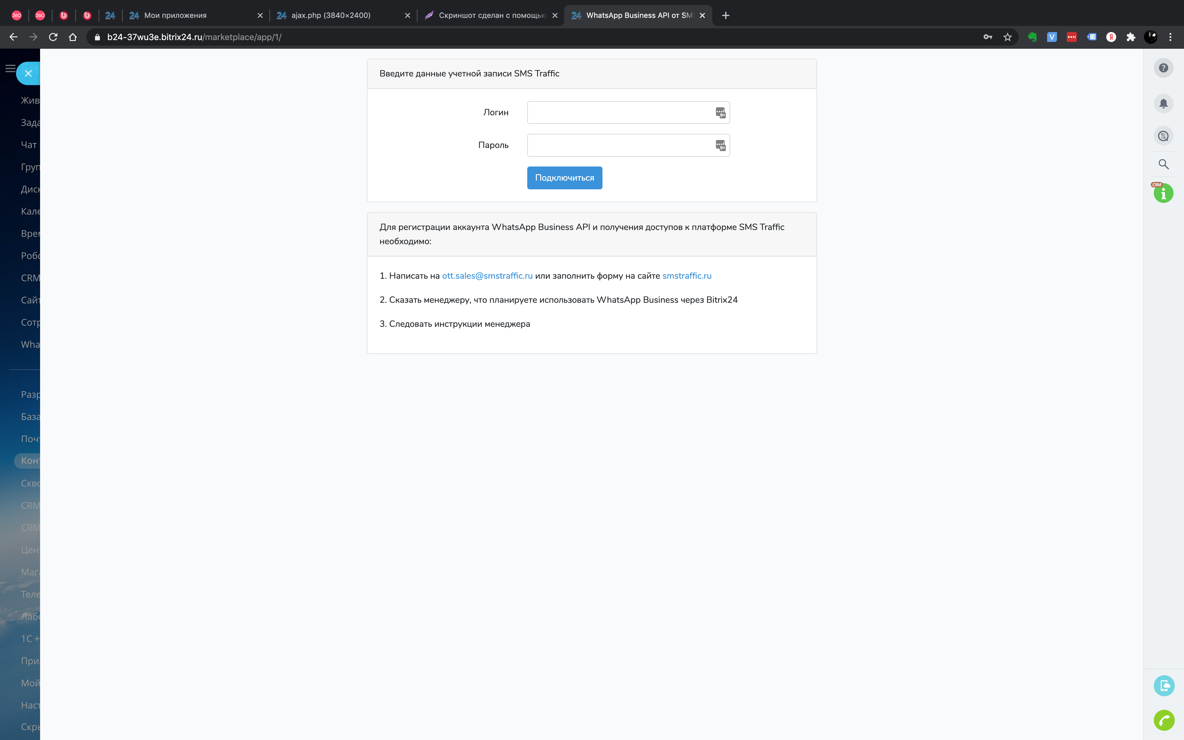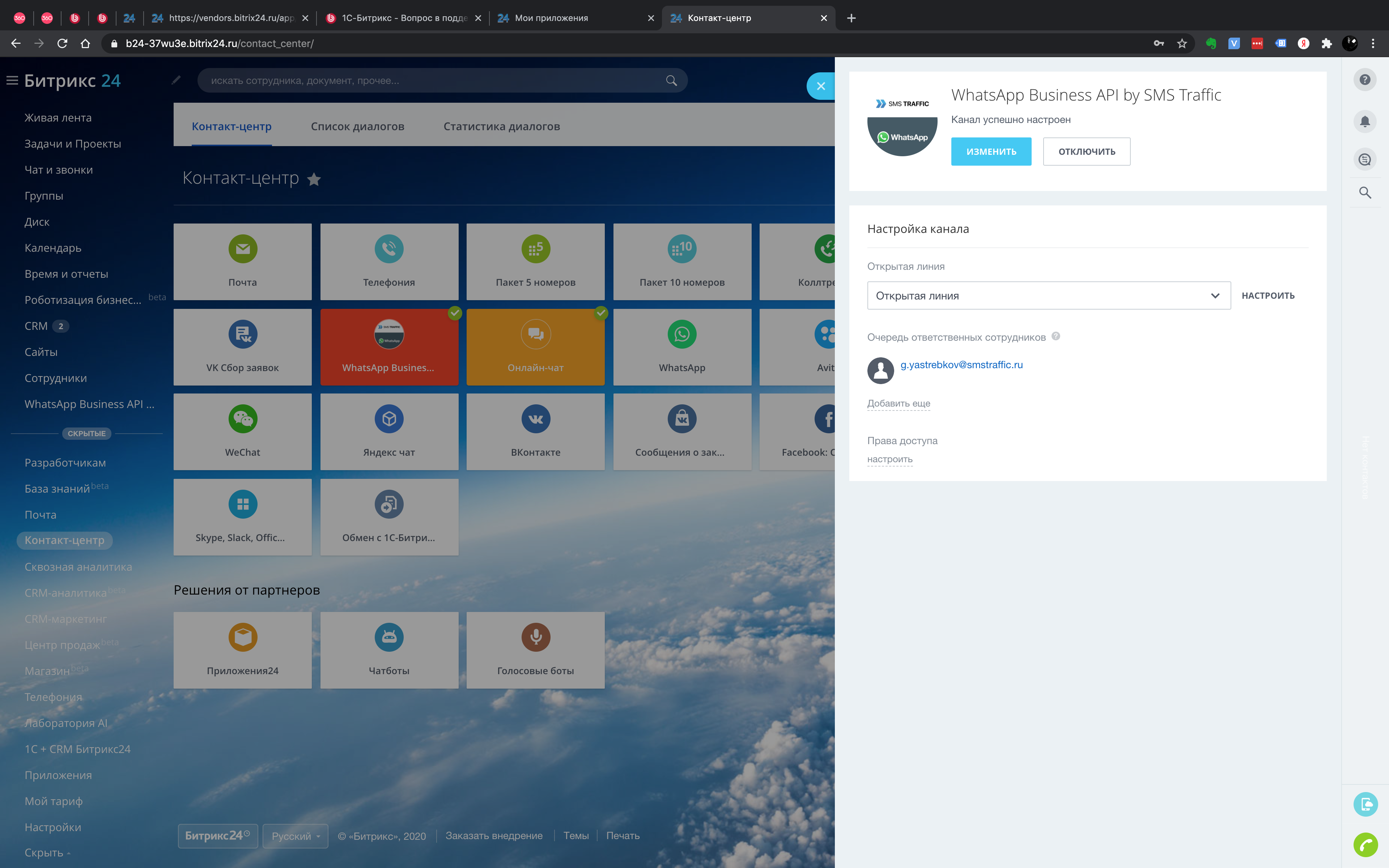Для использования модуля необходимо заключить договор на регистрацию и обслуживание aккаунта WhatsApp Business в компании SMS Traffic. Стоимость канала WhatsApp Business API от 10 000 рублей в месяц, в зависимости от необходимых объемов. Получить коммерческое предложение вы можете, написав на почту ott.sales@smstraffic.ru или отправив заявку на сайте smstraffic.ru