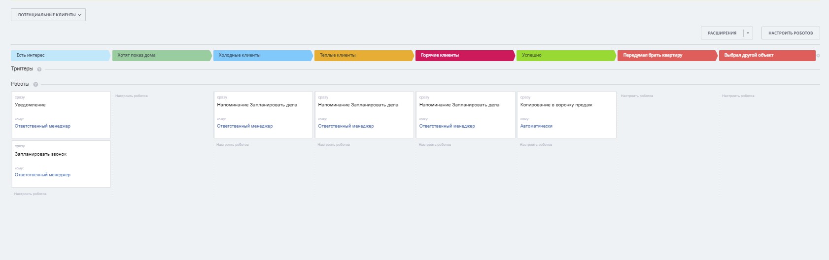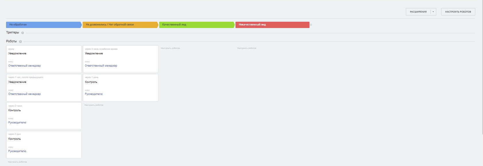 3) роботы автоматизации (уведомления, напоминания, копирование сделок, планирование звонков, постановка задач, роботы контроля)