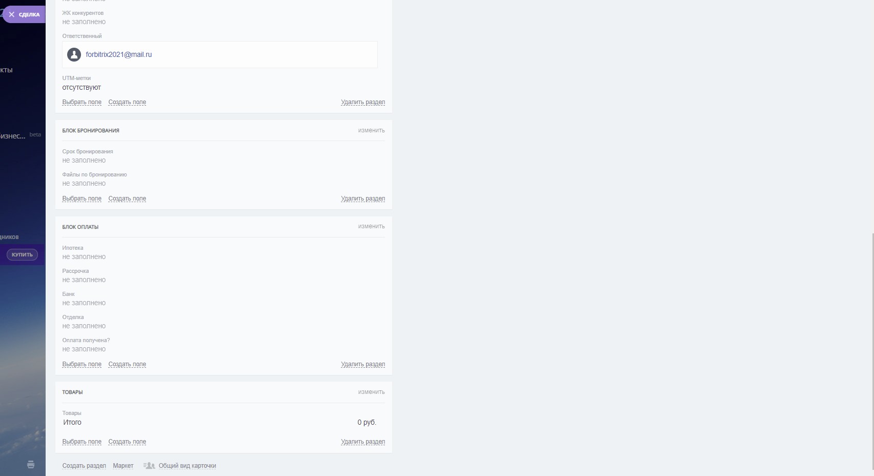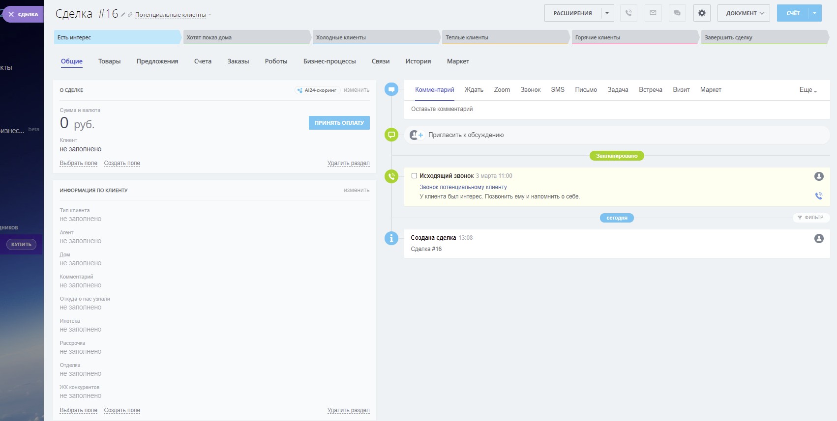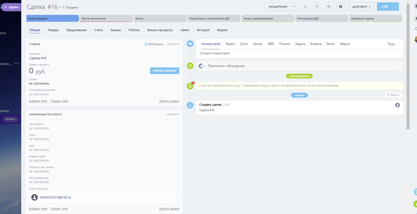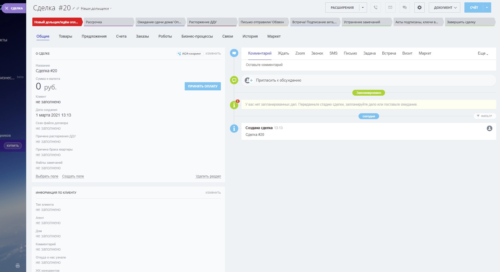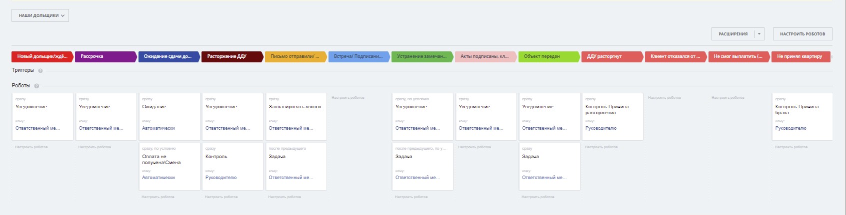 1) 3 воронки (“Потенциальные клиенты”, “Продажа”, “Наши дольщики”)