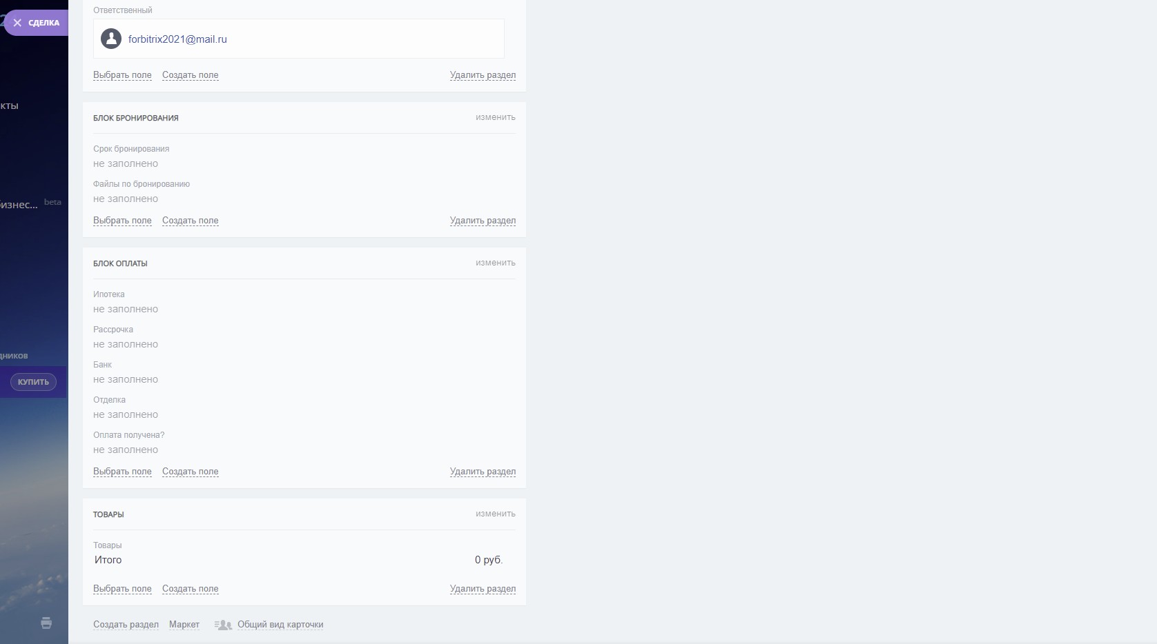 4) настроенные карточки сделок, контактов, и лидов (см скриншоты)