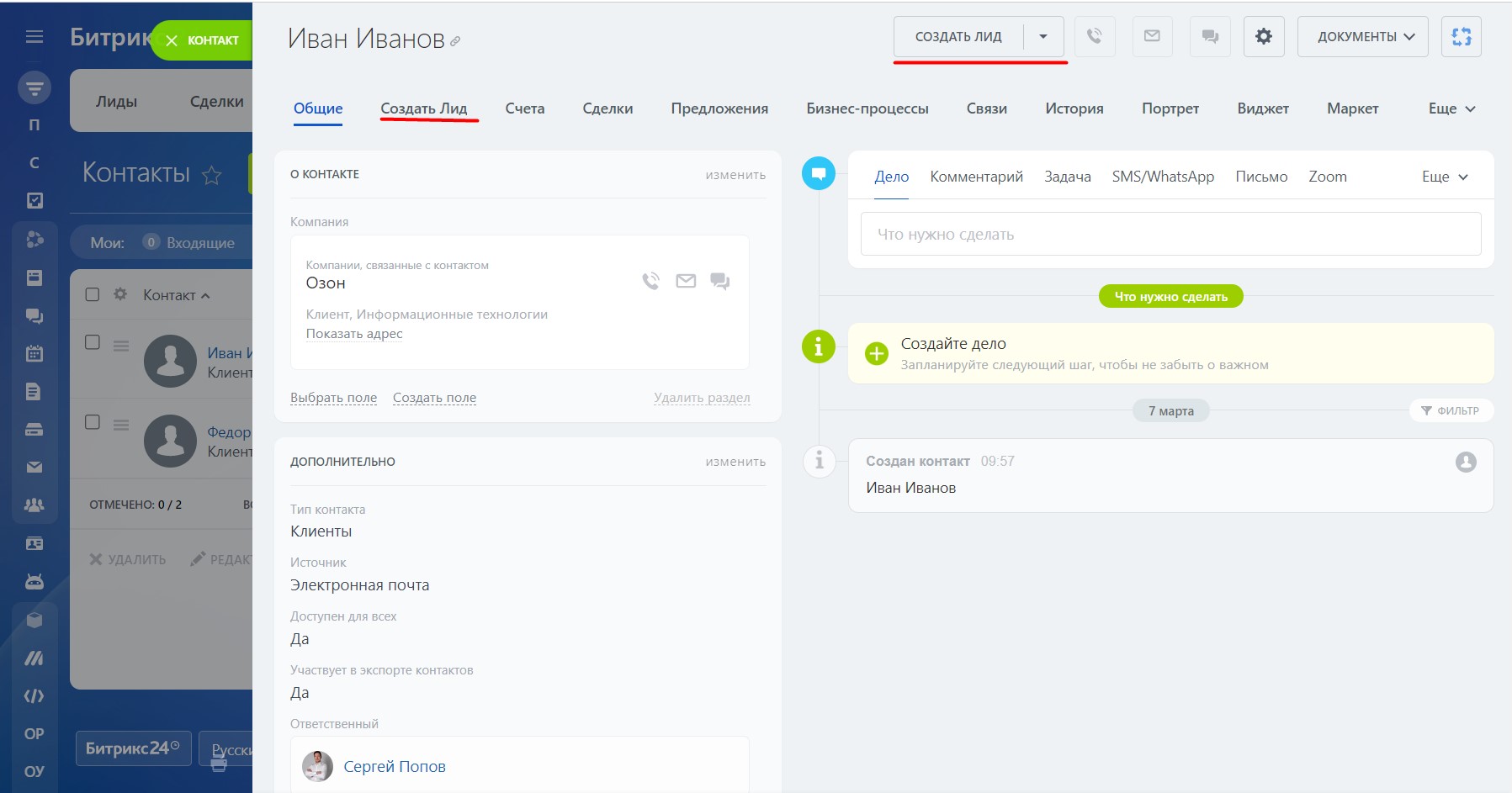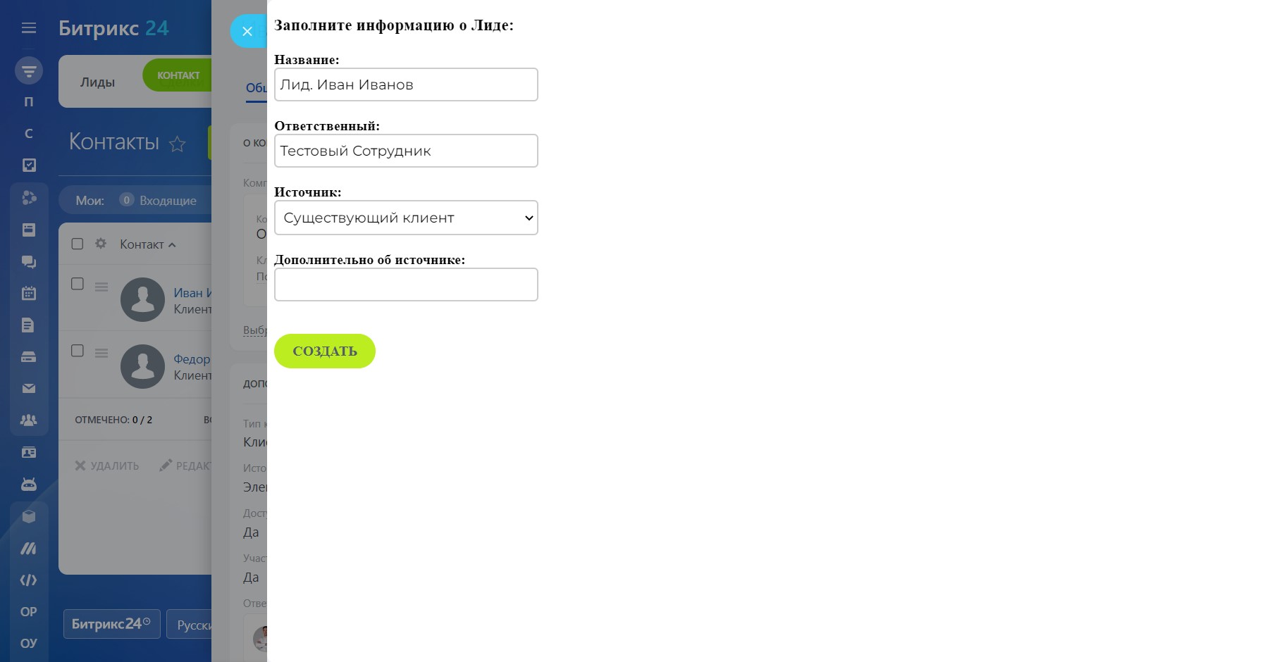 Создать Лид из Контакта или Компании