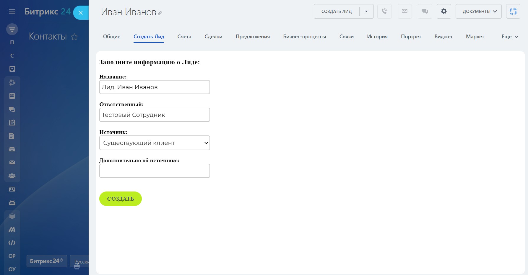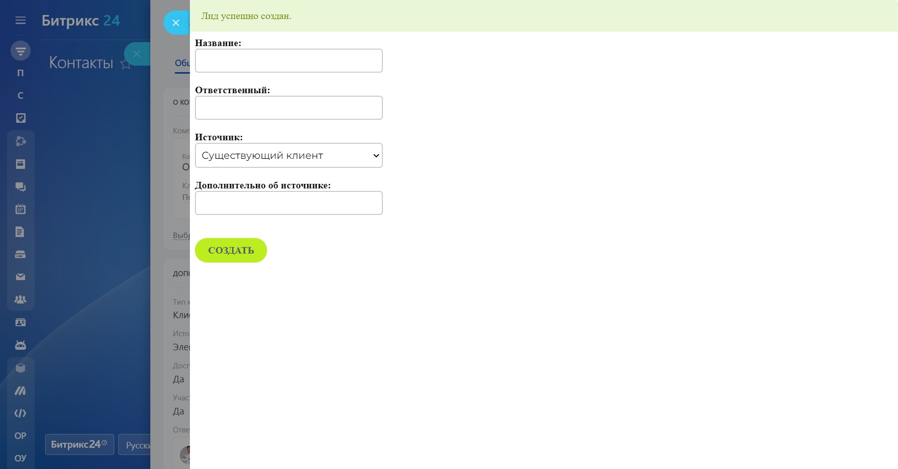 Создание Лида из карточки Контакта или Компании