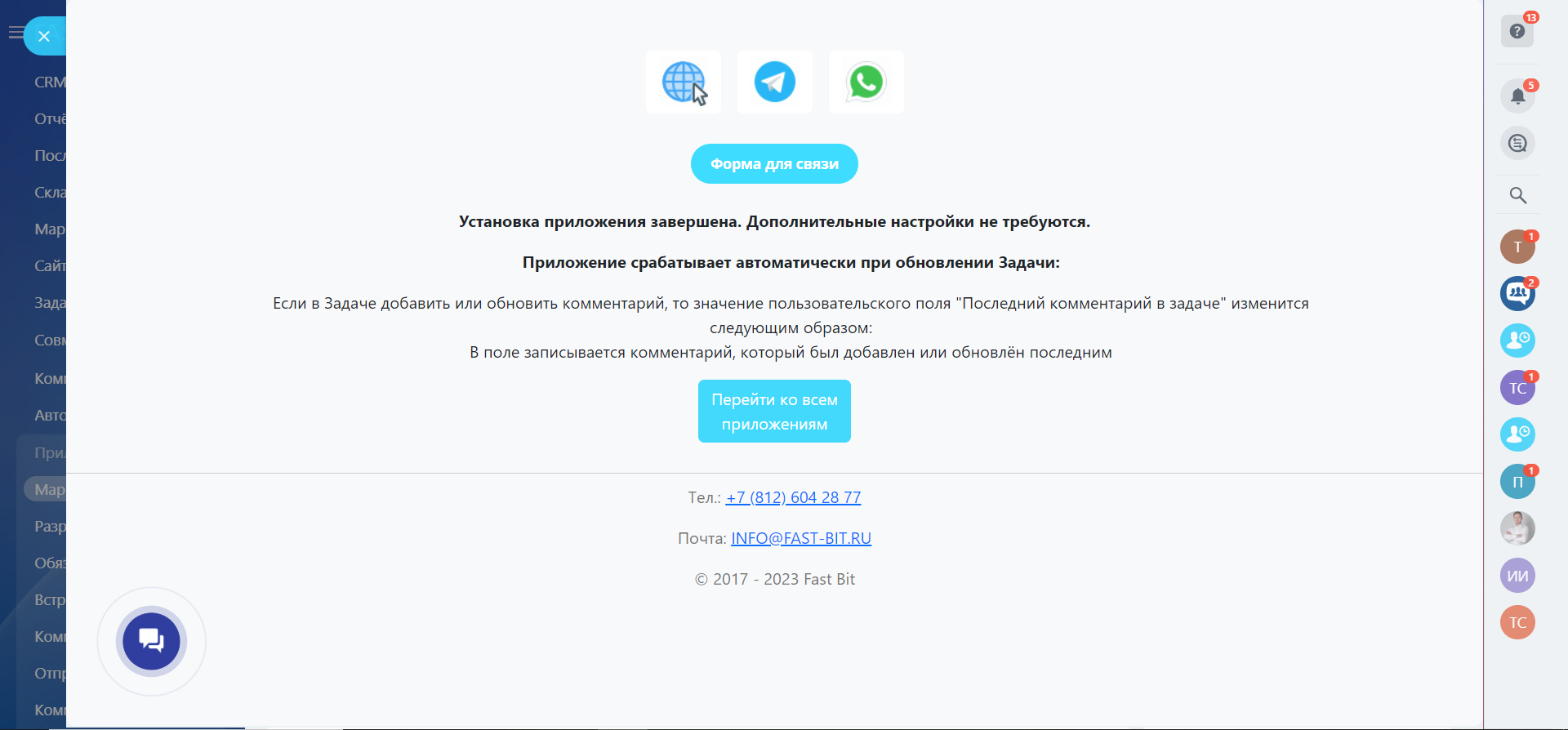 Автоматическая запись комментариев: Приложение мониторит события добавления и обновления комментариев в задаче. Когда такое событие происходит, приложение мгновенно обновляет пользовательское поле с последним комментарием, позволяя всегда быть в курсе текущего состояния задачи.