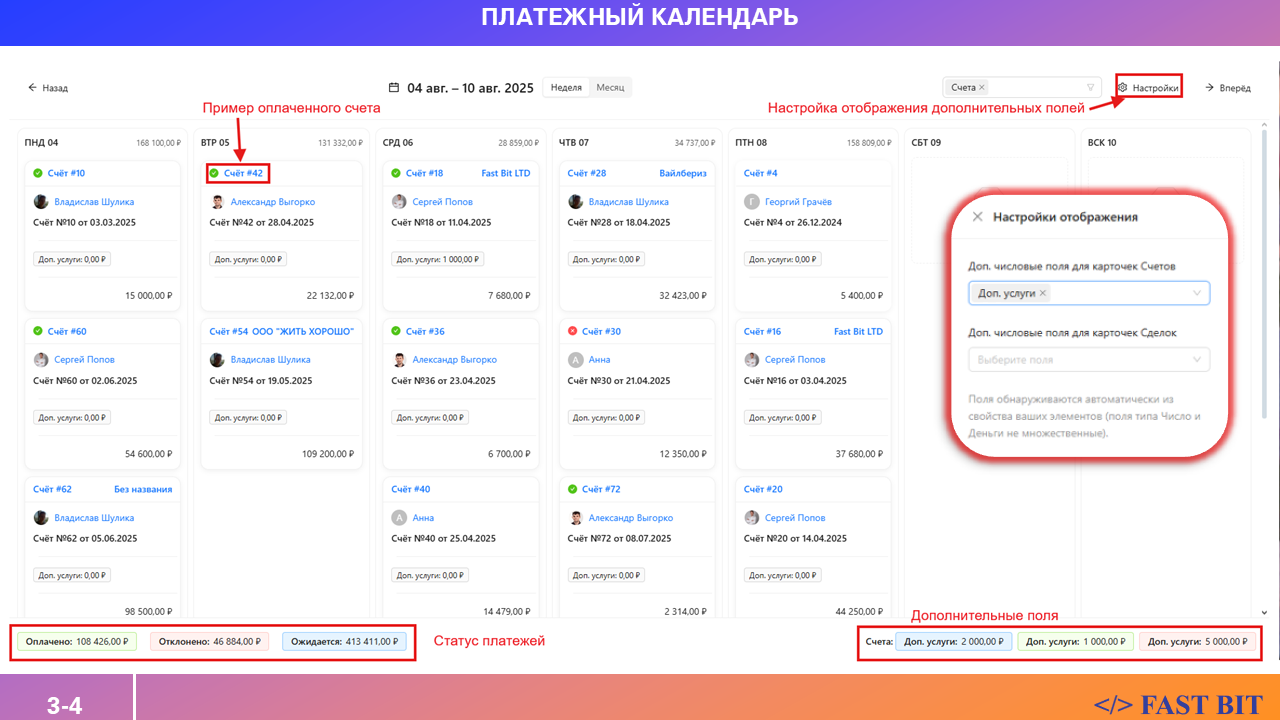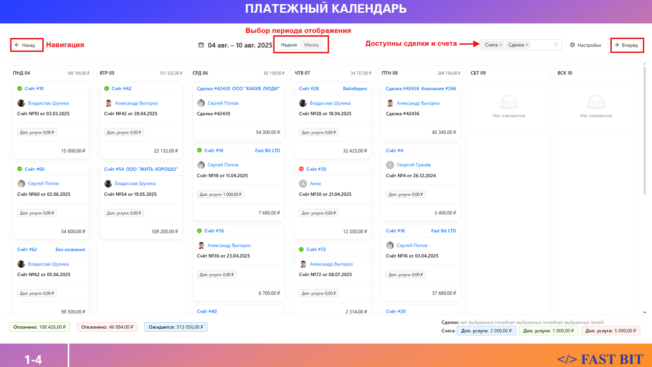Платёжный календарь — это визуальный инструмент в виде календаря, который позволяет отслеживать ожидаемые и фактически полученные оплаты по сделкам и счетам. Вы выбираете интересующую неделю (с понедельника по воскресенье) или месяц, и в один клик видите, какие суммы уже поступили, а какие ещё в ожидании.
