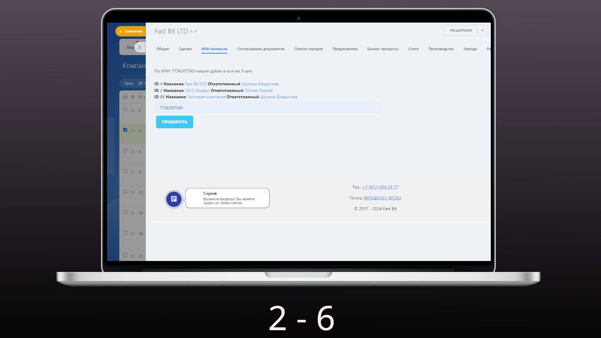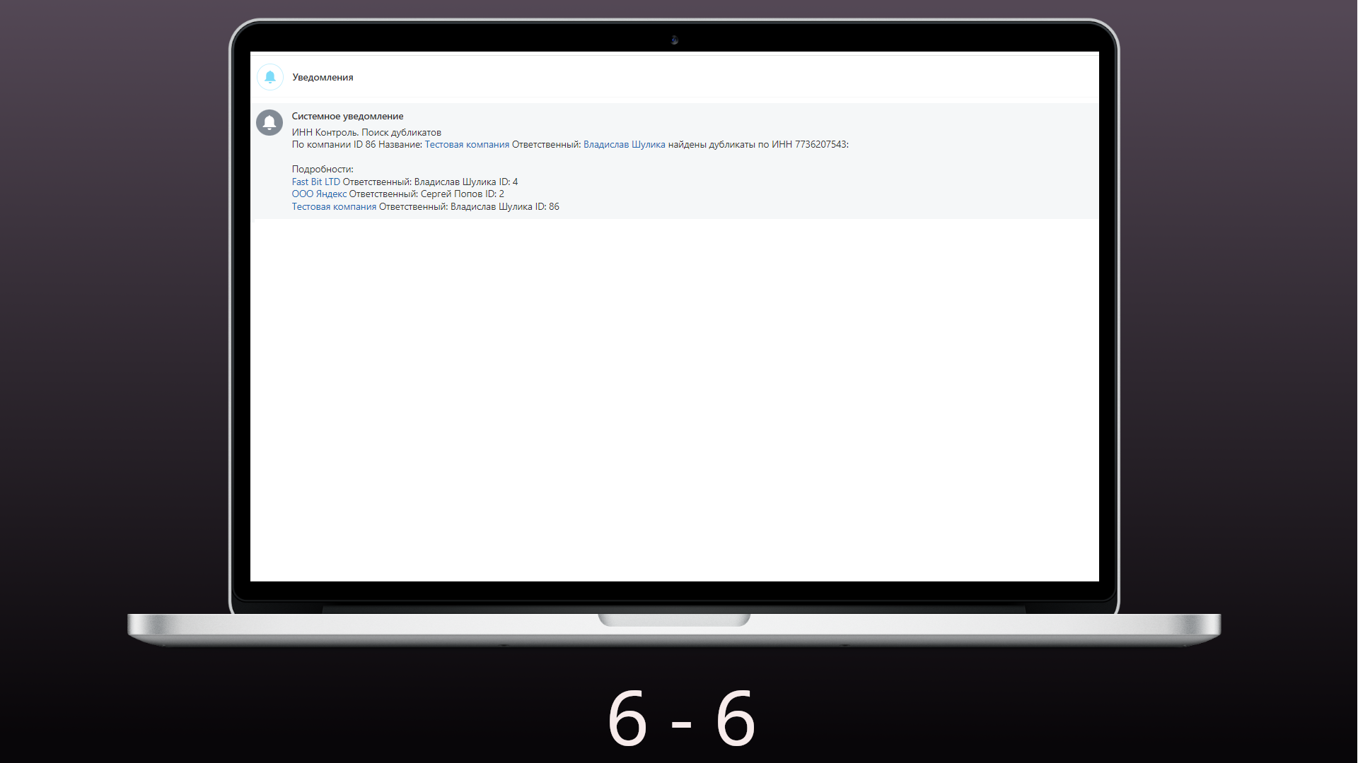 И это еще не все! ИНН Контроль также предотвращает появление дубликатов данных. Если менеджер случайно добавил компанию с уже существующим ИНН, система моментально оповестит его и ответственного за данную компанию об этом, направив ссылки на дубликаты. Это поможет сохранить базу данных в чистоте и порядке.