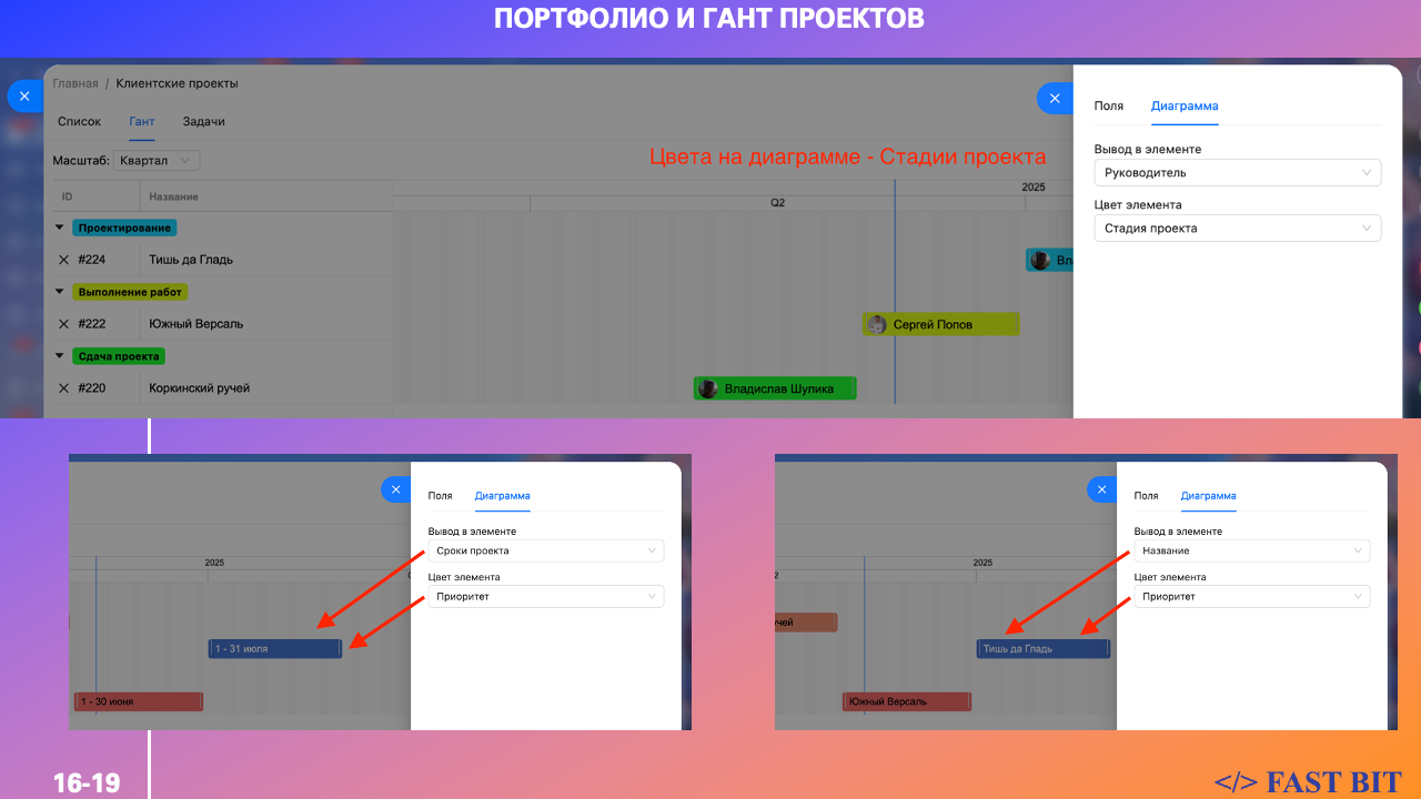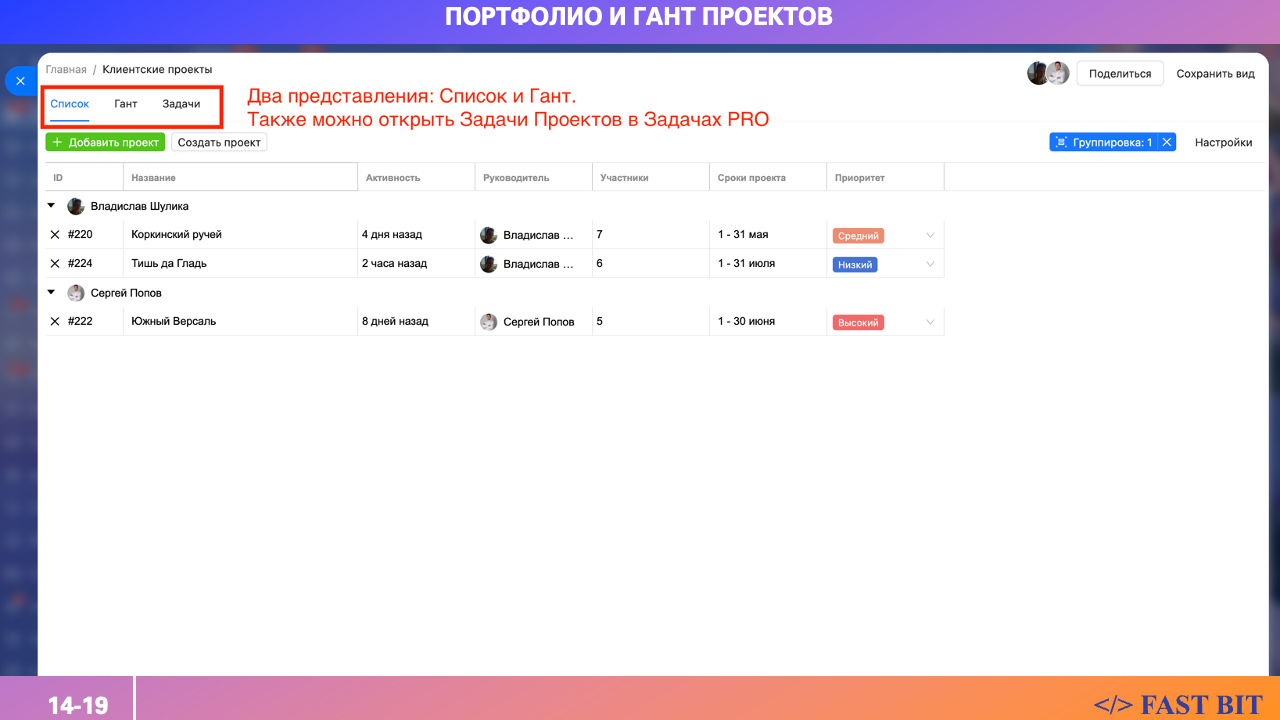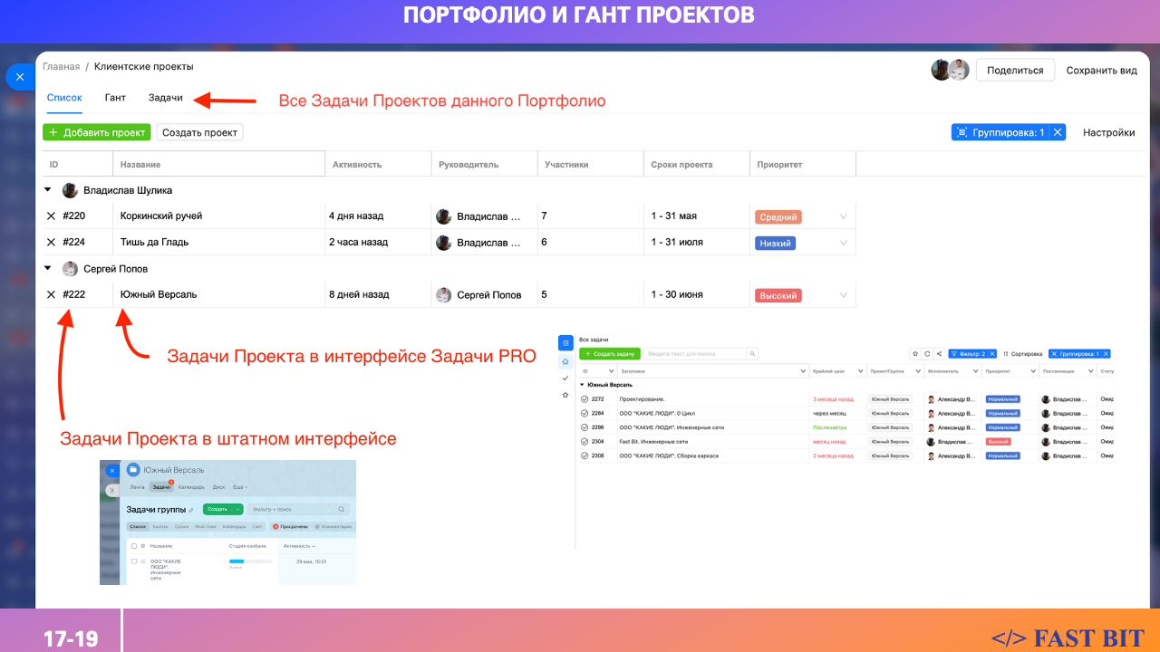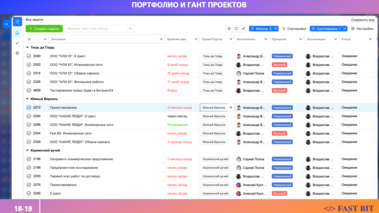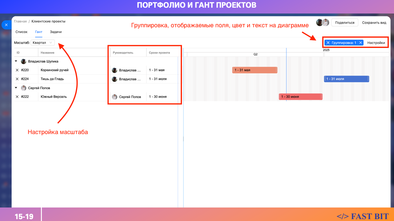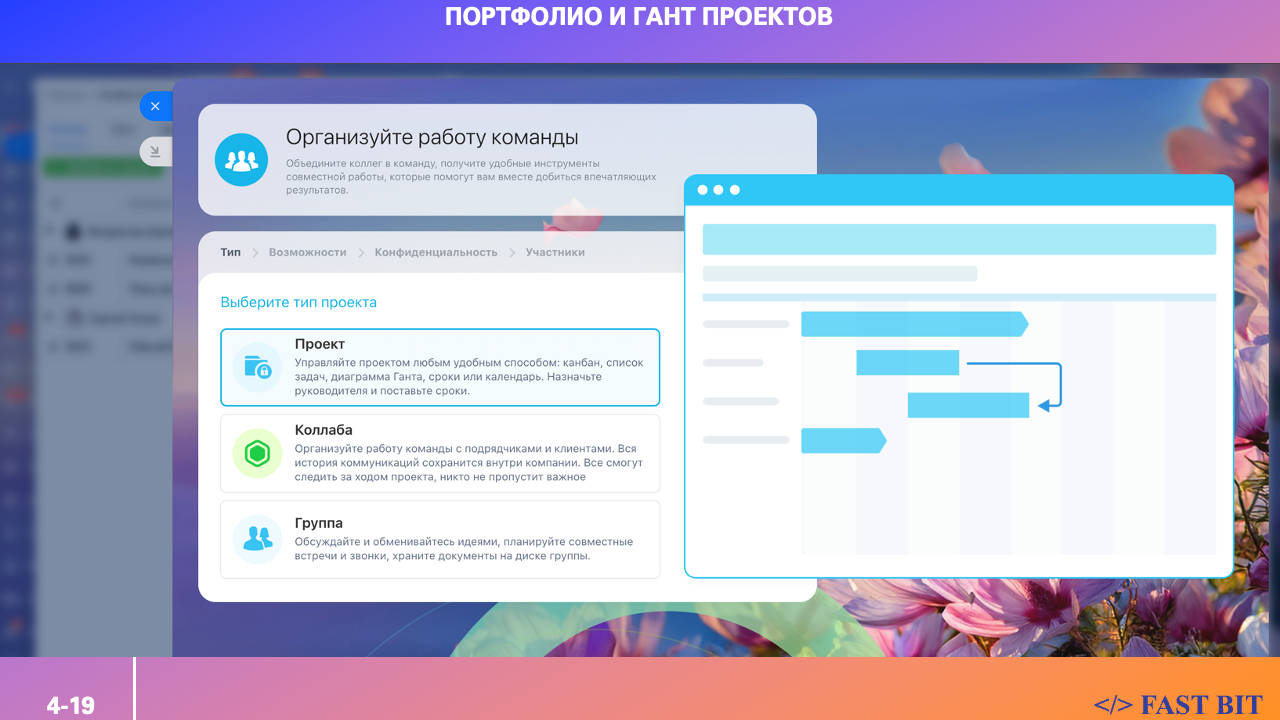 Портфолио (Группировка и Гант Проектов) — это инструмент для управления проектами в Битрикс24, который помогает группировать Проекты, Группы, Коллабы, Потоки и Скрамы, контролировать сроки, управлять загрузкой команды и оптимизировать процессы. Поддерживает гибкое планирование, отчётность и совместную работу.
