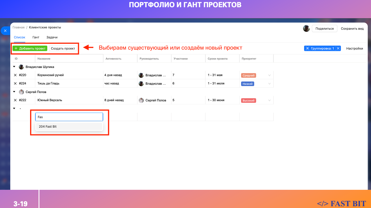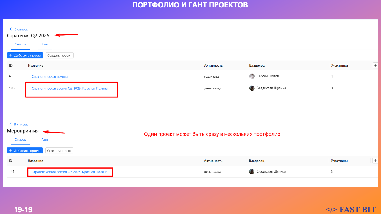 Множественная привязка Проекта — один проект можно добавить сразу в несколько Портфолио. Например, "Стратегическая сессия" может быть частью "Стратегии" и "Мероприятий" одновременно.