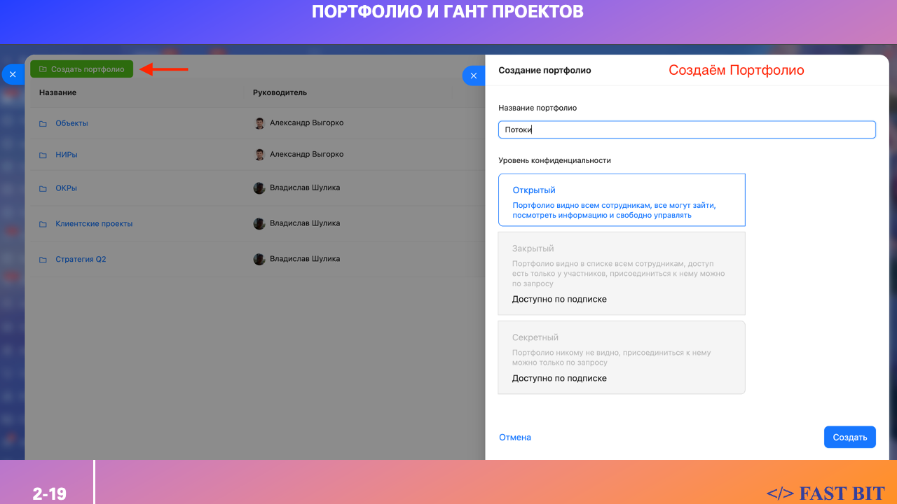 Закрытый: Портфолио видно в списке всем сотрудникам, доступ есть только у участников, присоединиться к нему можно по запросу