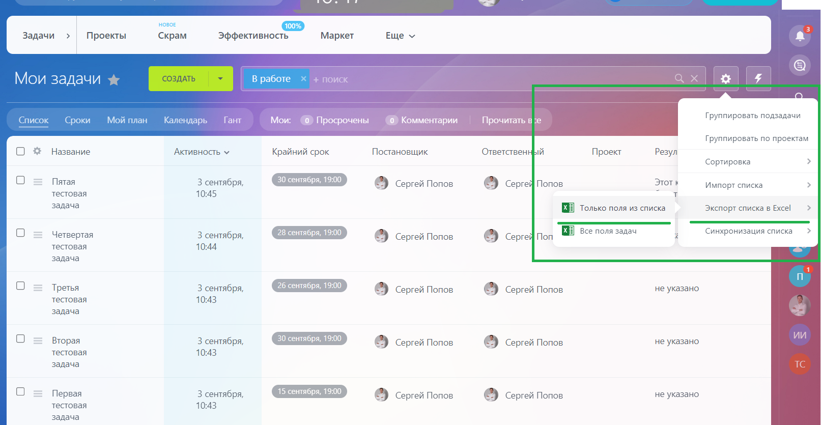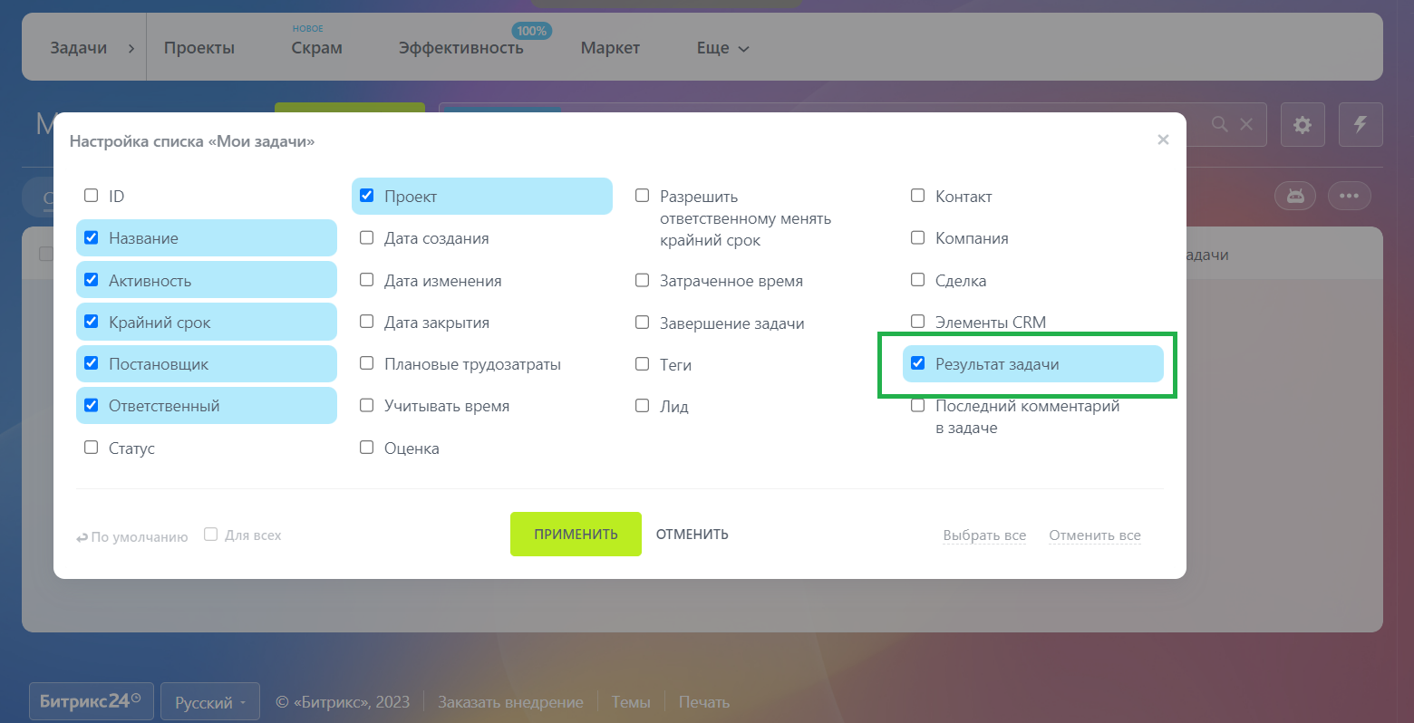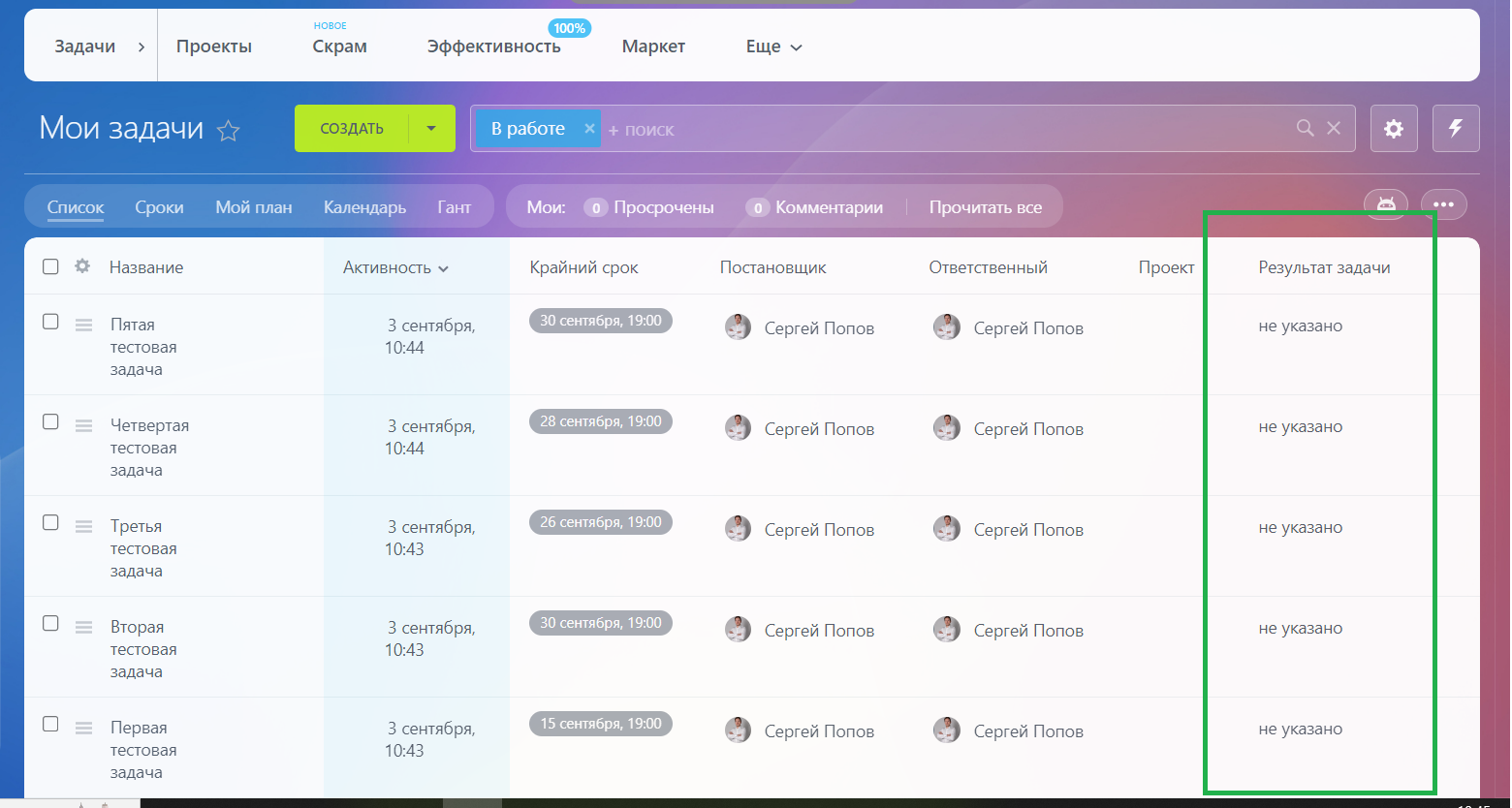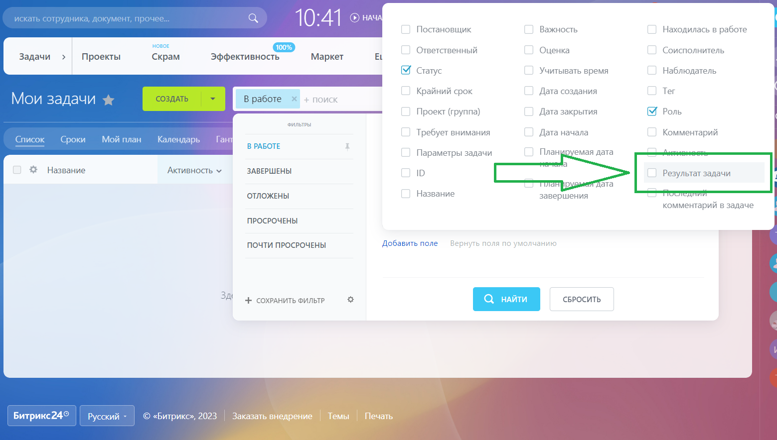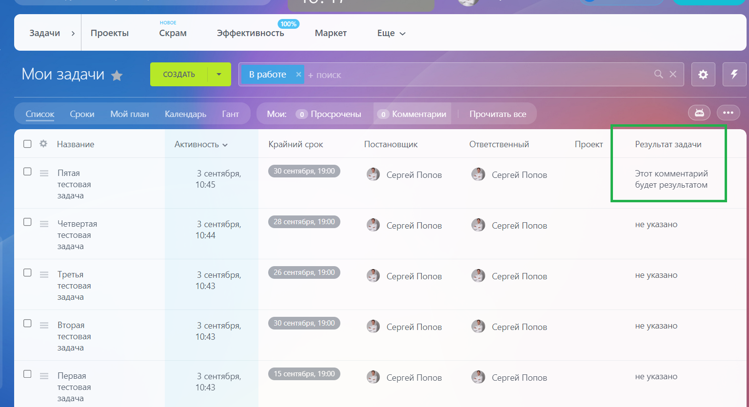 В Задачах есть возможность отмечать комментарий к Задаче как результат выполнения Задачи, но нет возможности в общем списке Задач, с помощью фильтра, посмотреть все задачи и результат выполнения задачи, а тем более выгрузить эти данные в эксель.