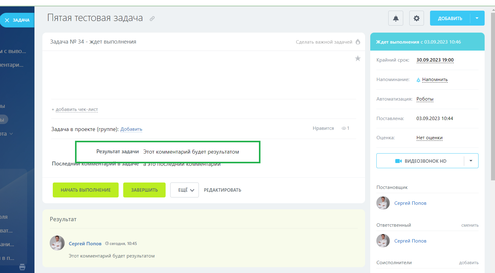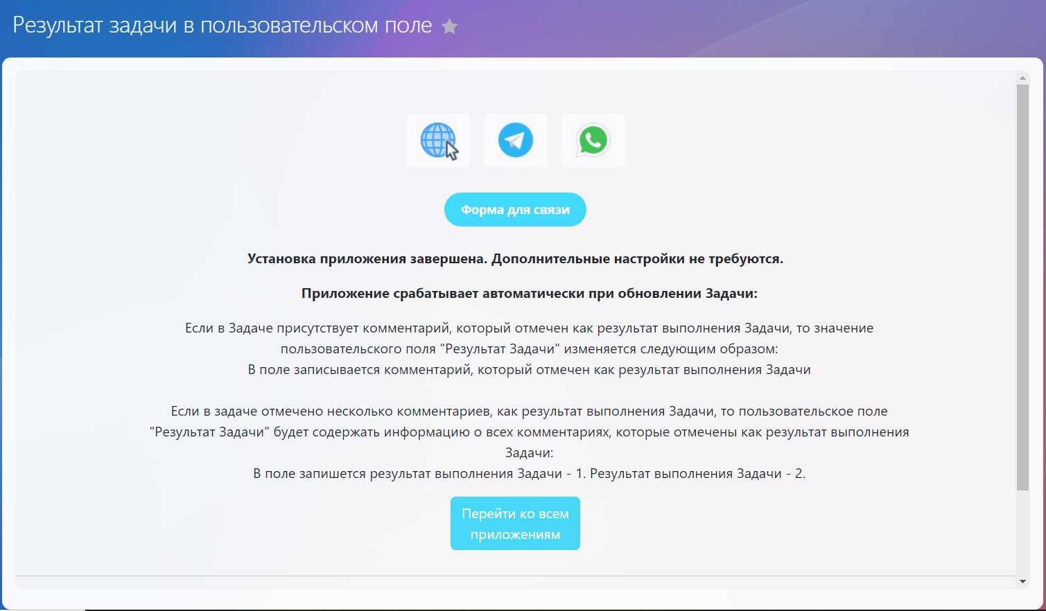 Для решения этой задачи мы придумали данное приложение, которое регистрирует пользовательское поле в Задачах и автоматически заполняет его комментарием, который отмечают как результат выполнения Задачи.