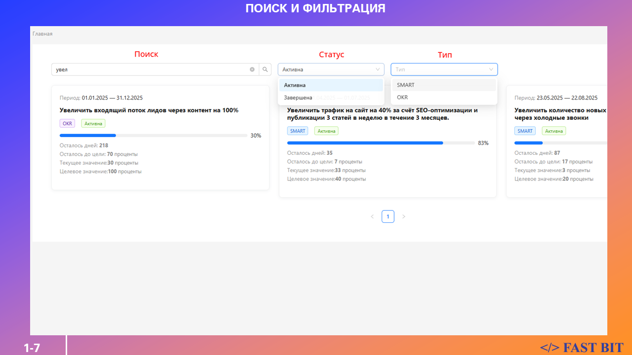 Быстрый поиск по целям по названию, типу и статусу