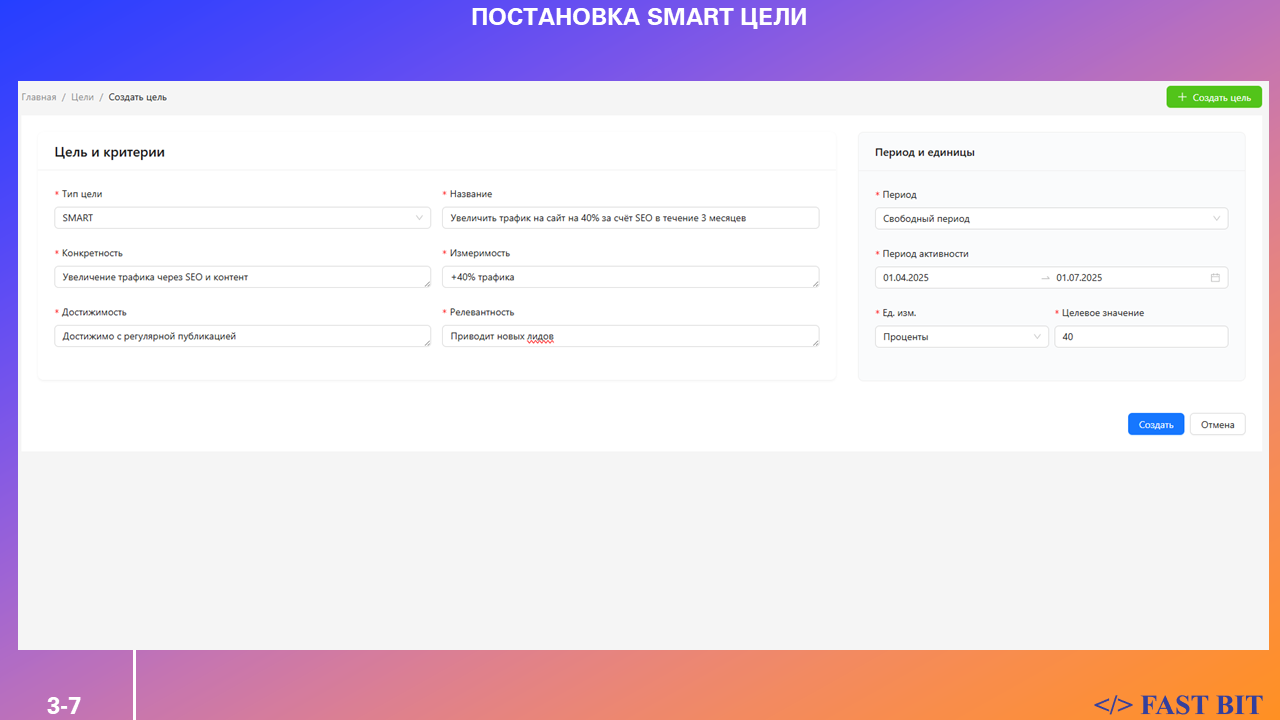 Пример SMART-цели:Увеличить количество лидов с сайта на 20% за 2 месяца за счёт SEO-оптимизации.