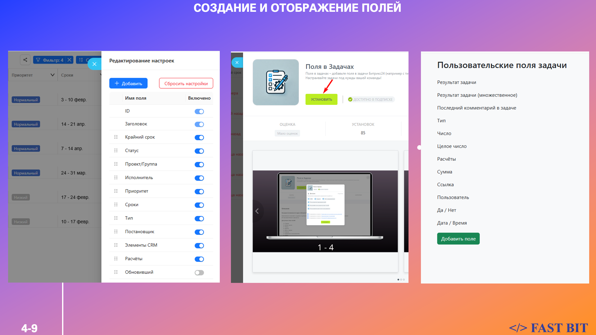 Вы можете не только редактировать поля в списке, но и создавать новые пользовательские поля, включая списки и поля с привязкой к цветам — чего нет в штатной функциональности Битрикс24.