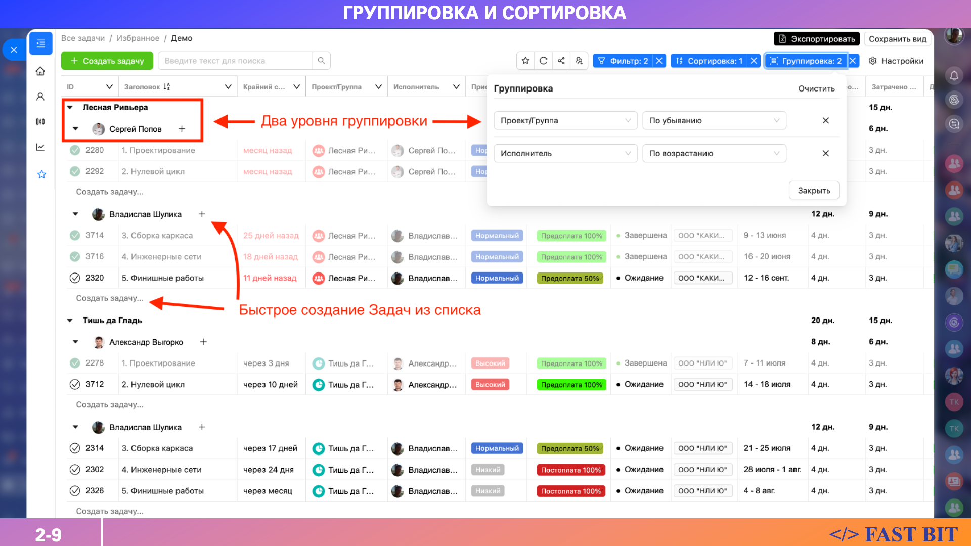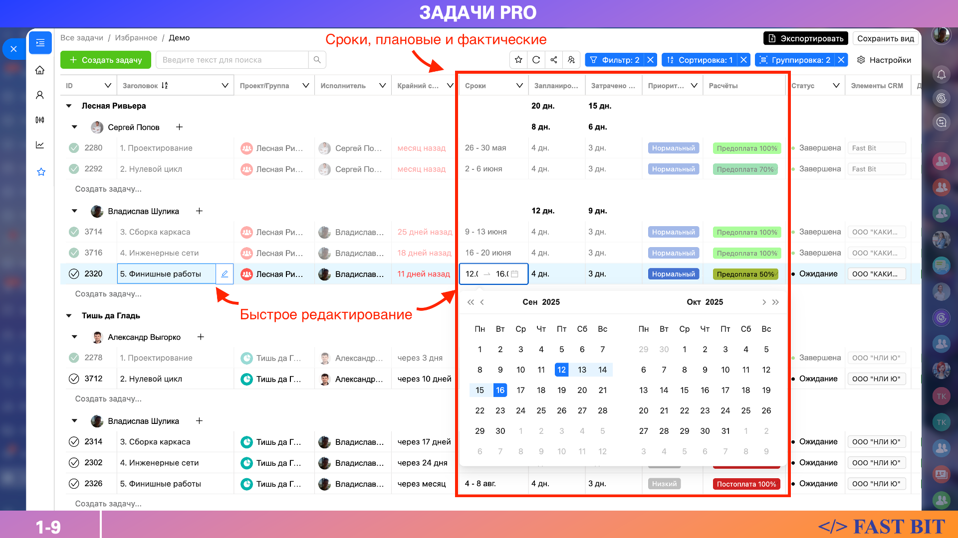 Онлайн создание и редактирование задач прямо в списке (Grid-режим).