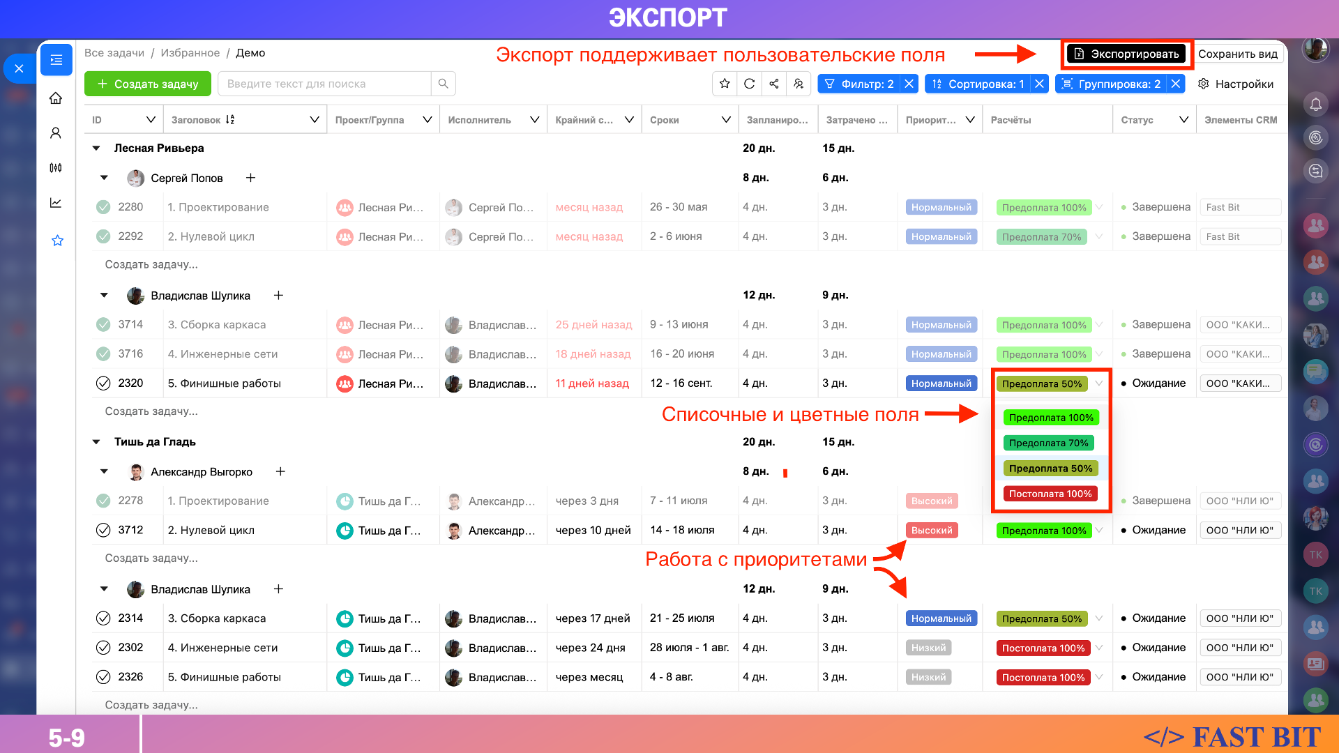 Для каждого представления можно настроить поля (включая ширину колонок), группировку, сортировку и фильтры. Эти настройки можно сохранить и поделиться ссылкой с коллегами. У руководителя или участника команды откроется тот же самый список — с точной настройкой, которую вы задали. Это упрощает коммуникацию, контроль и позволяет действовать быстрее.