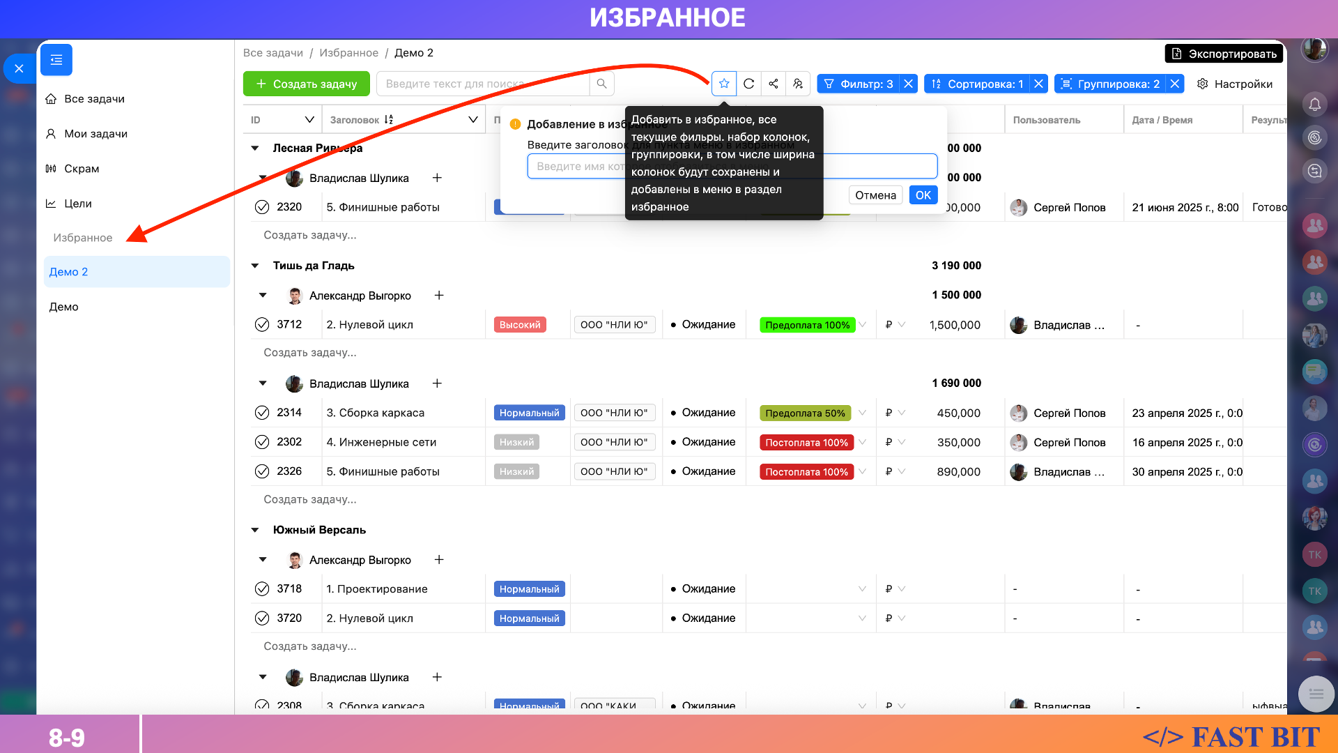 Чтобы не теряться в потоке задач, Задачи ПРО позволяет создавать избранные представления — своего рода «рабочие столы» для конкретных сценариев. Например: