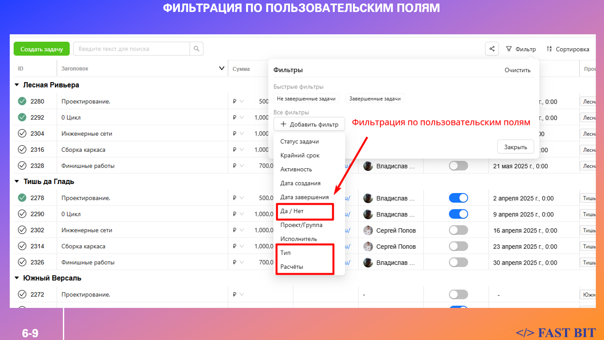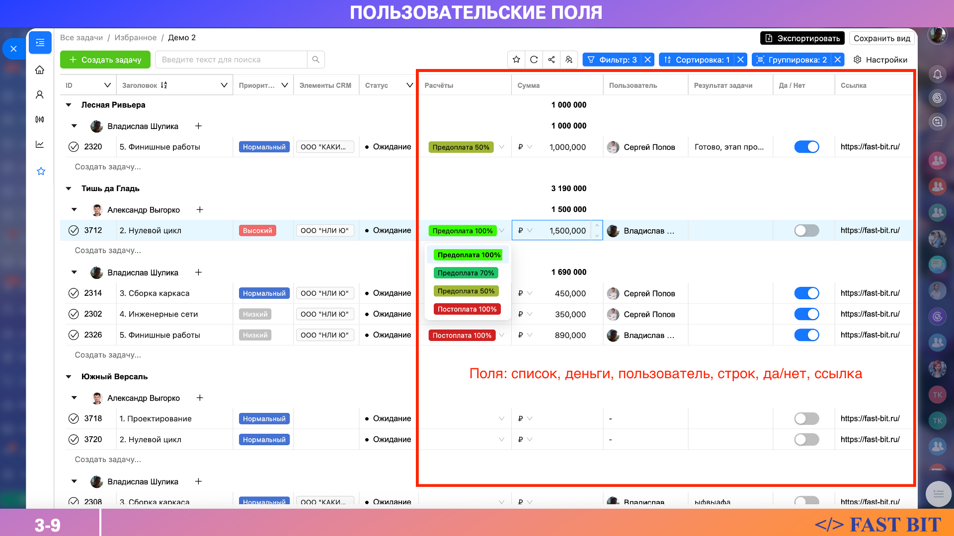 Задачи ПРО поддерживает все типы пользовательских полей, включая: