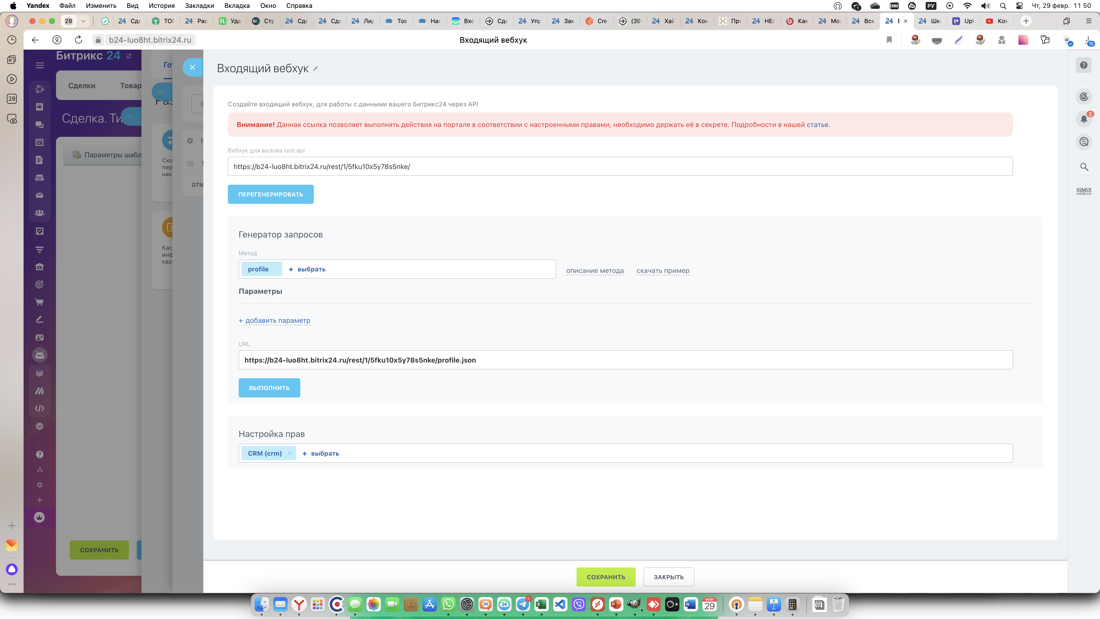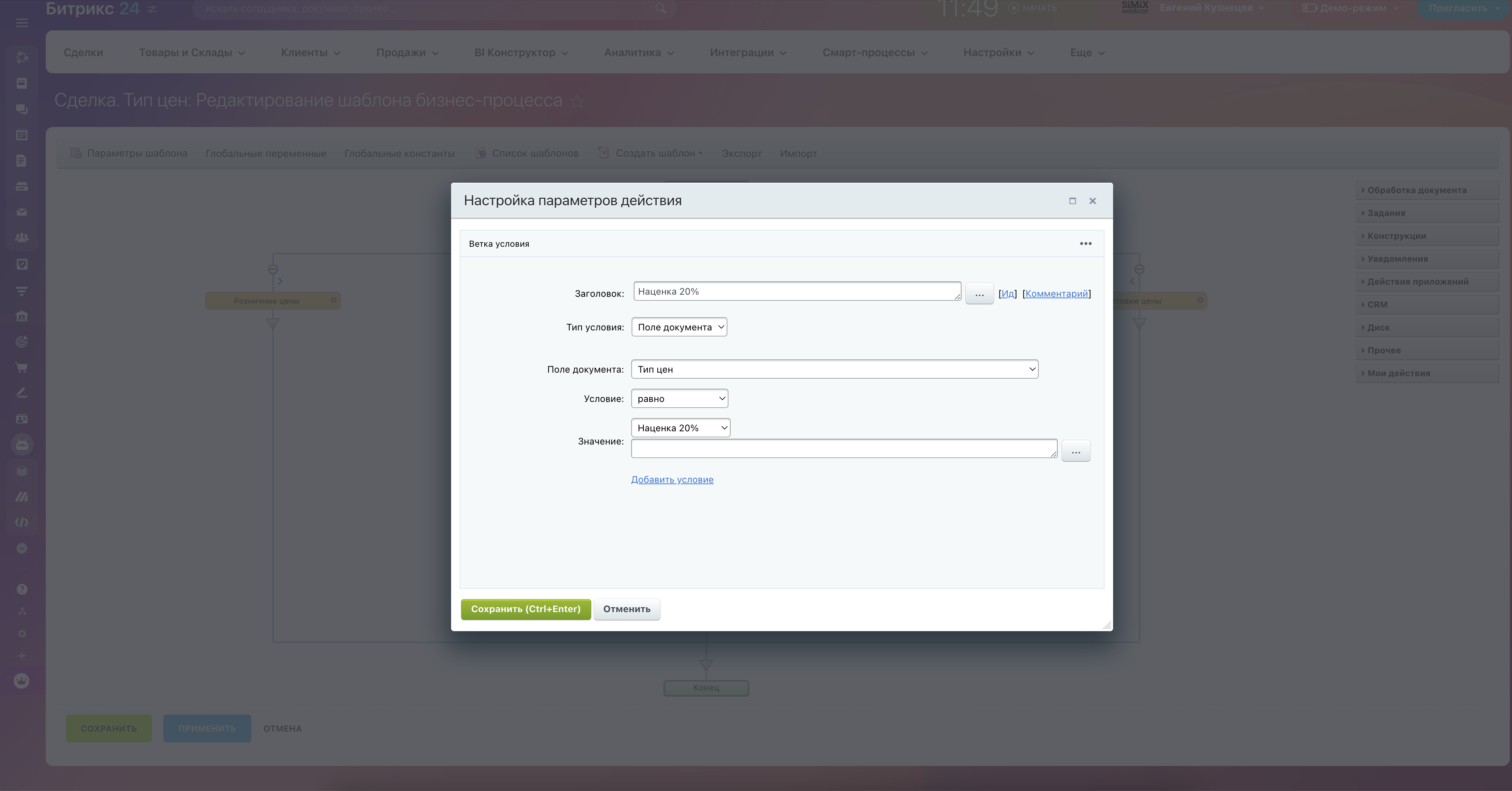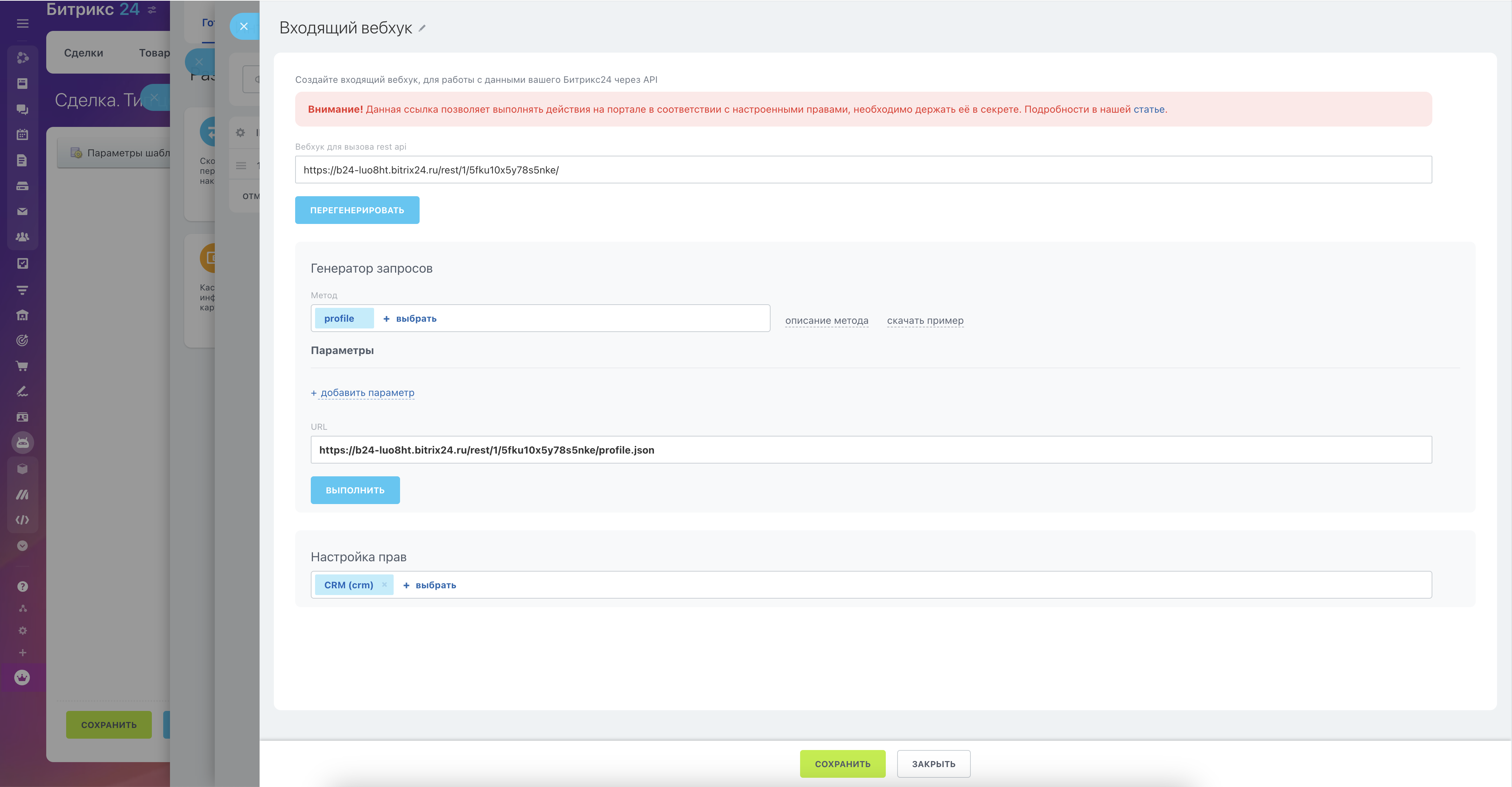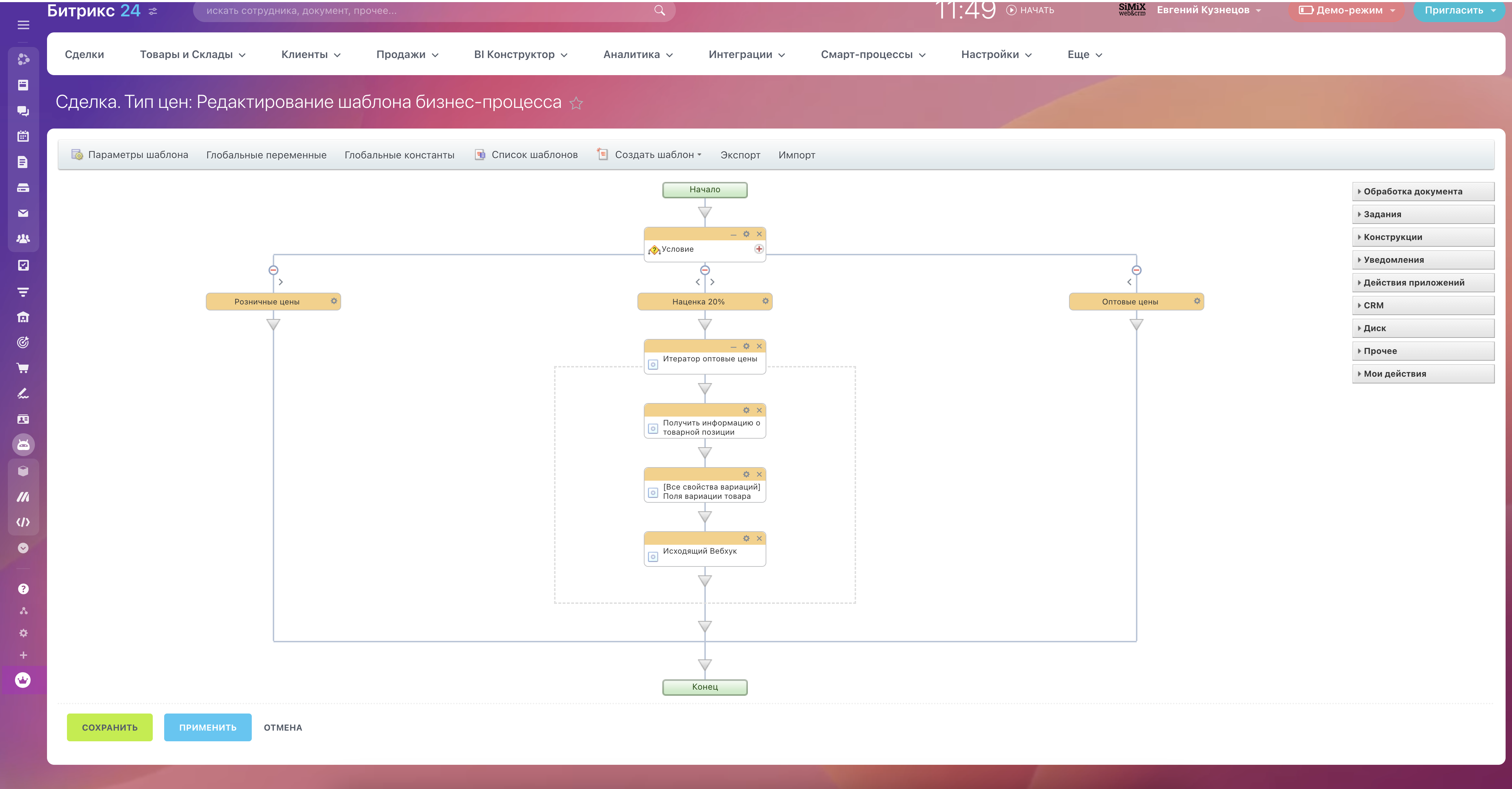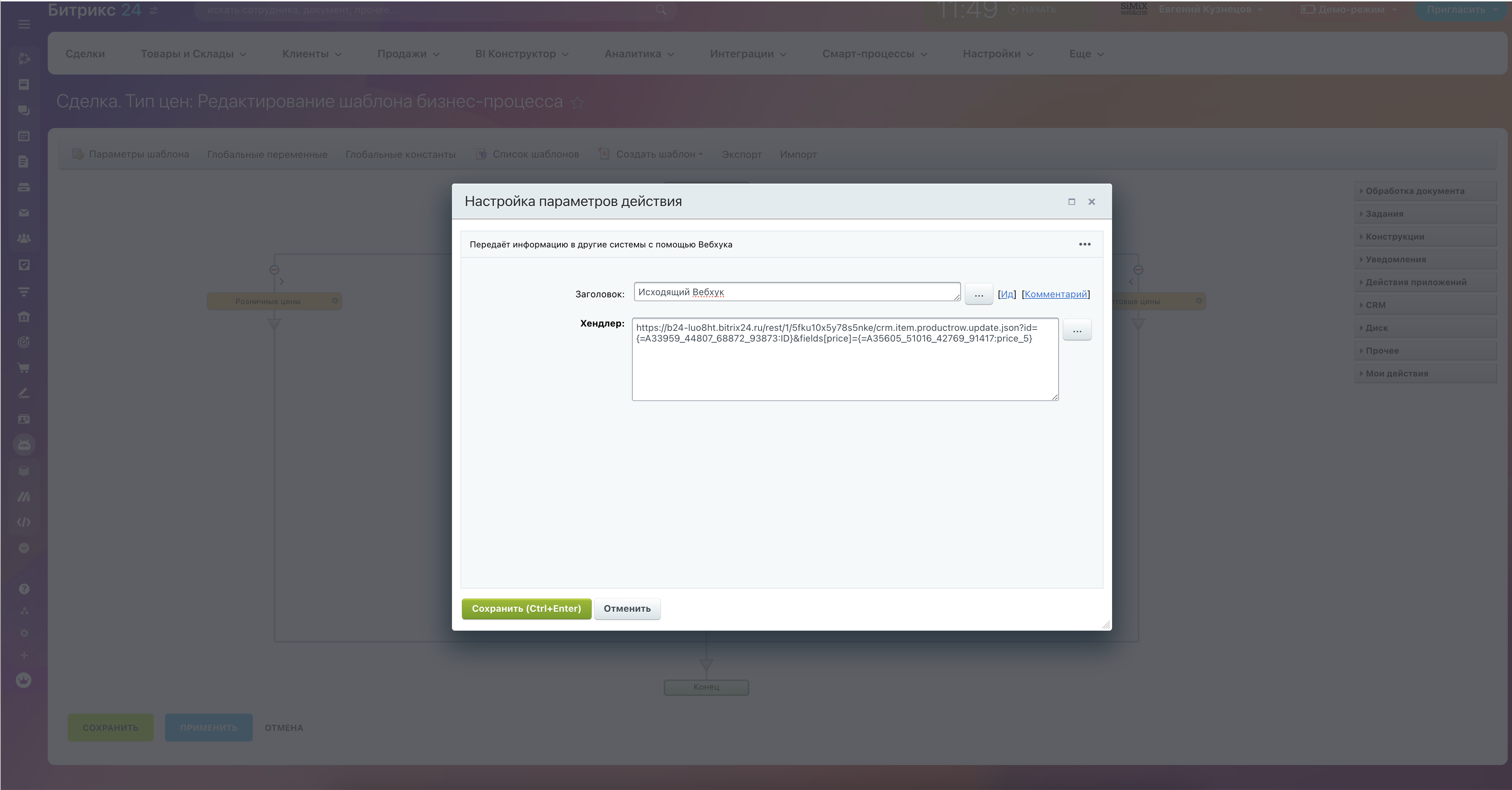 3. Для сценария использования типов цен создайте входящий вебхук с правами на CRM, используйте активити в бп, в исходящем вебхуке используйте следующие операторы: