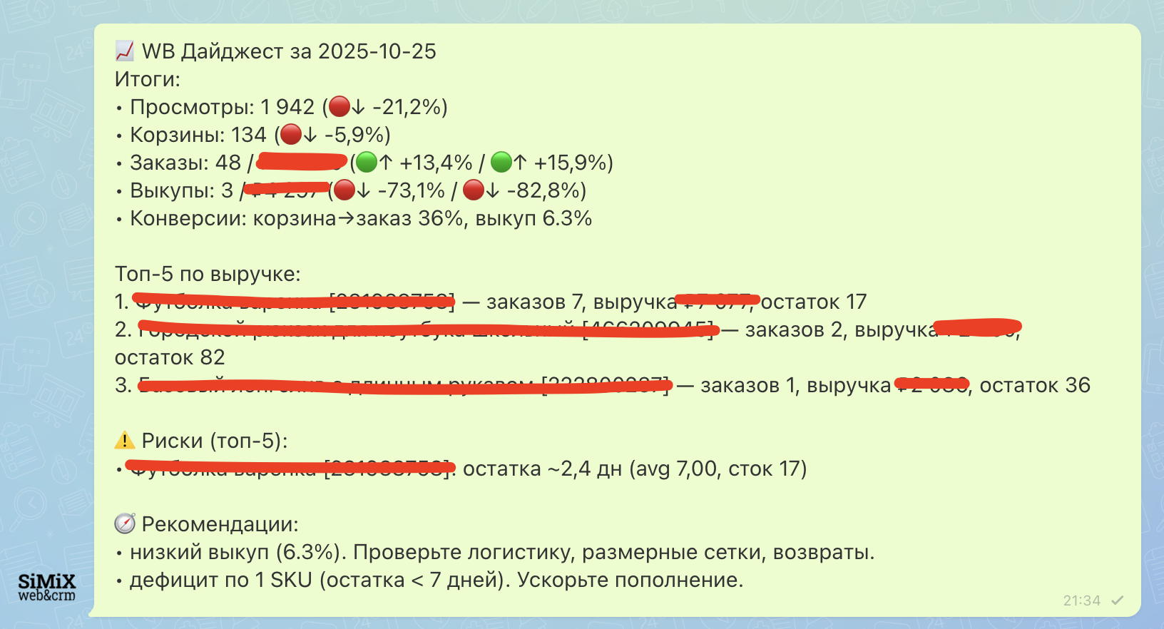 Ежедневный дайджест в чат Битрикс24: итоги за вчера, динамика к среднему за 7 дней, зона внимания по остаткам и рискам.