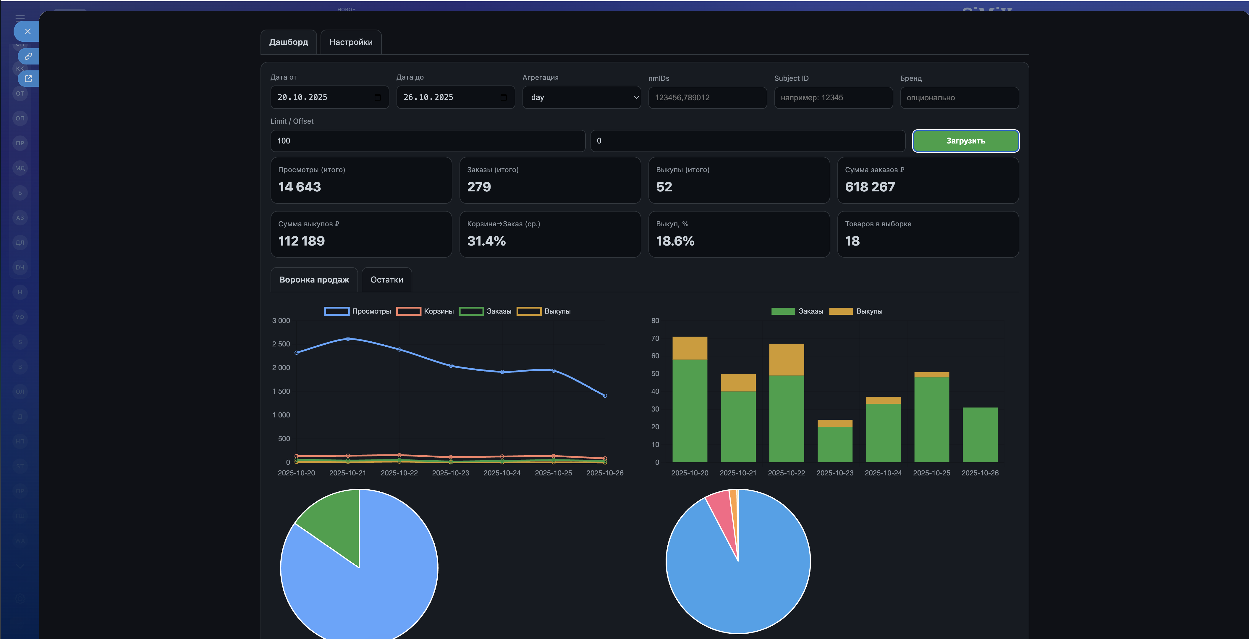 Дашборд «Воронка продаж»: просмотры карточек, добавления в корзину, заказы, выкупы, суммы заказов и выкупов, конверсии.