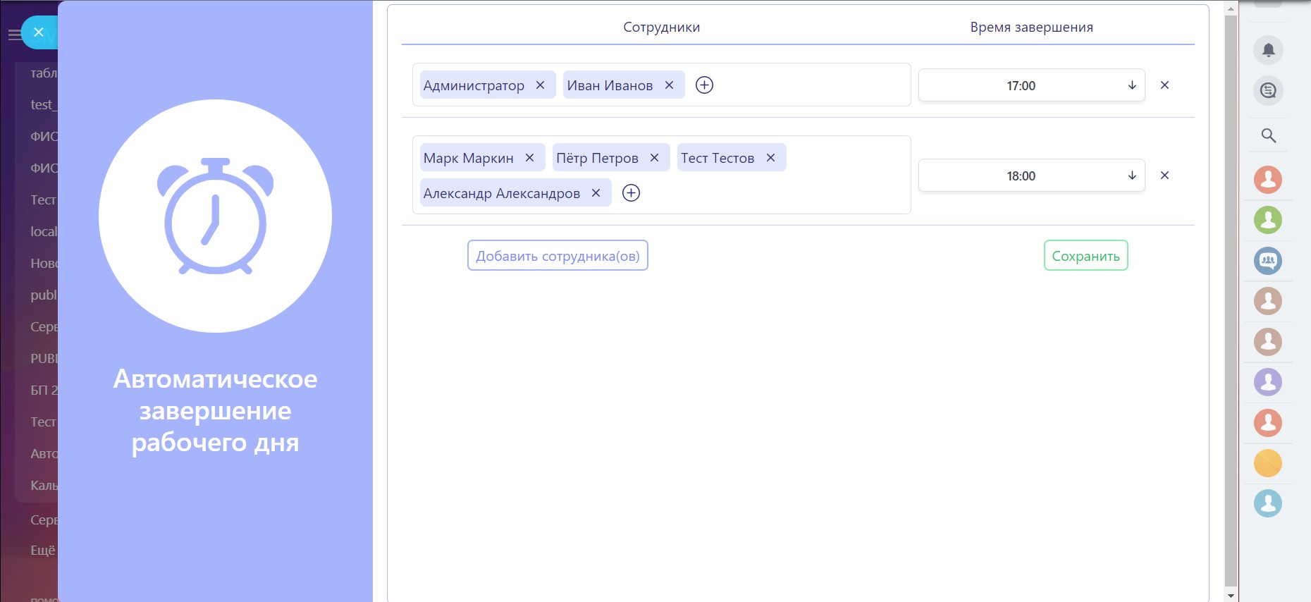 - Гибкость настроек: администратор настраивает время завершения рабочего дня по указанию руководства и в соответствии с нужным часовым поясом.