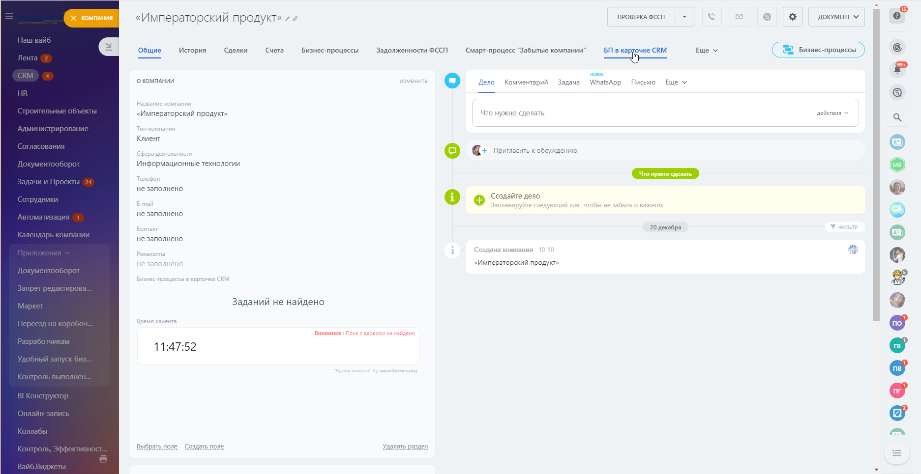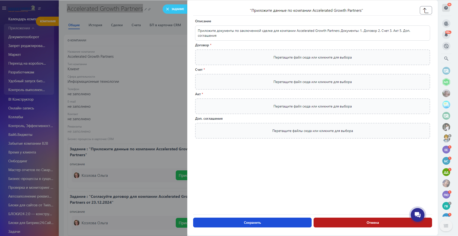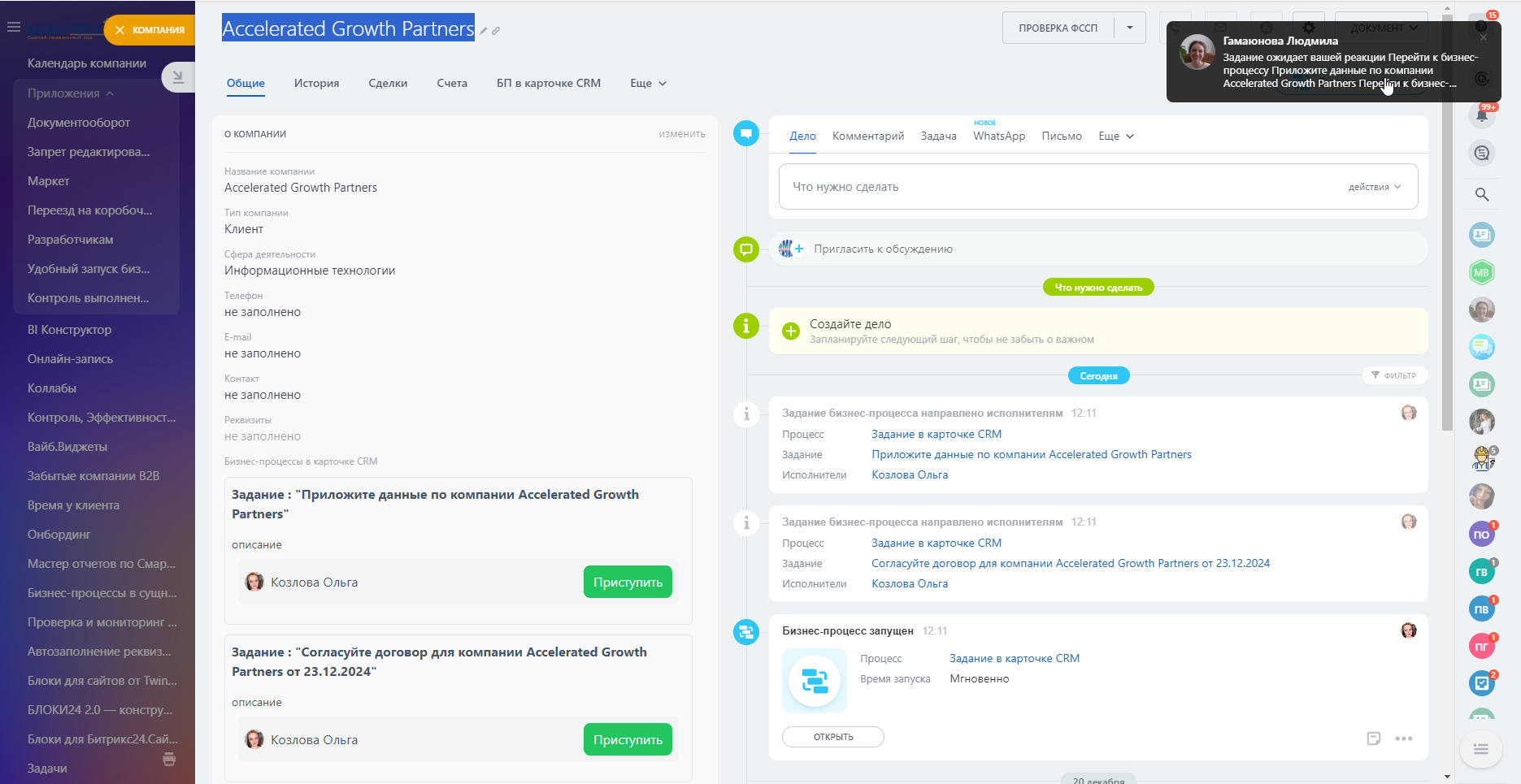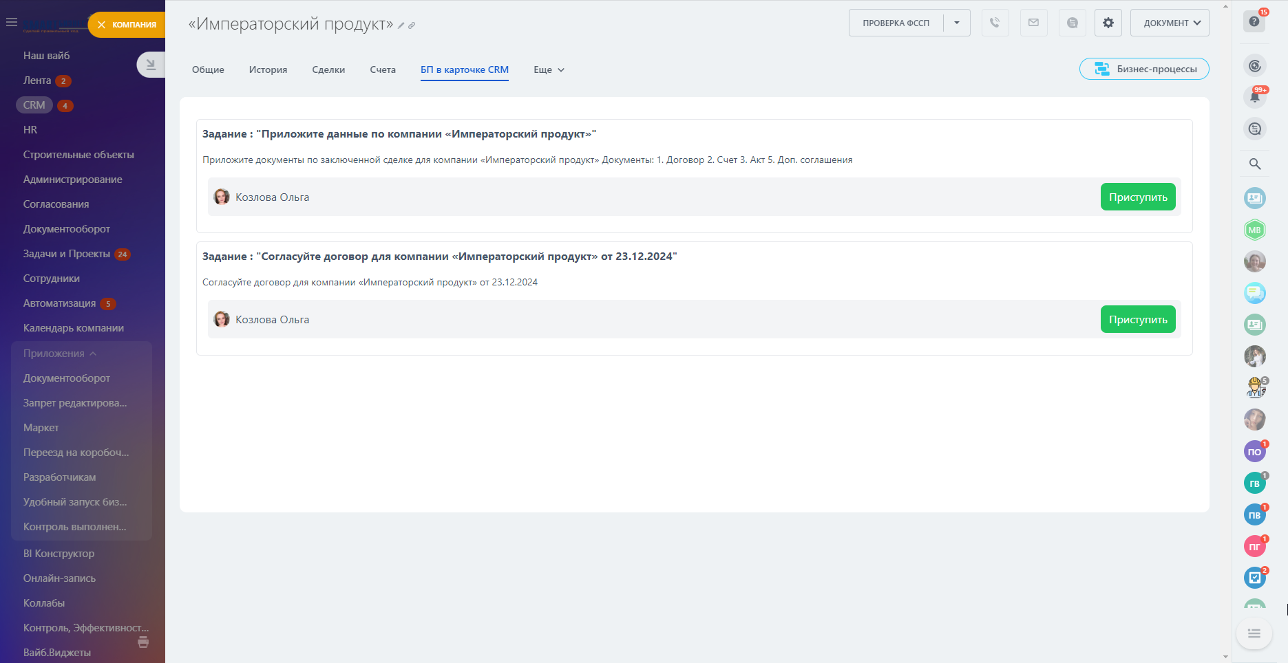 Отображение заданий бизнес-процессов в полях и меню карточек CRM: лиды, сделки, контакты, компании, смарт-процессы. Работа сотрудников в одном окне - не переключаясь на другие разделы Битрикс24. Удобный дизайн заданий.