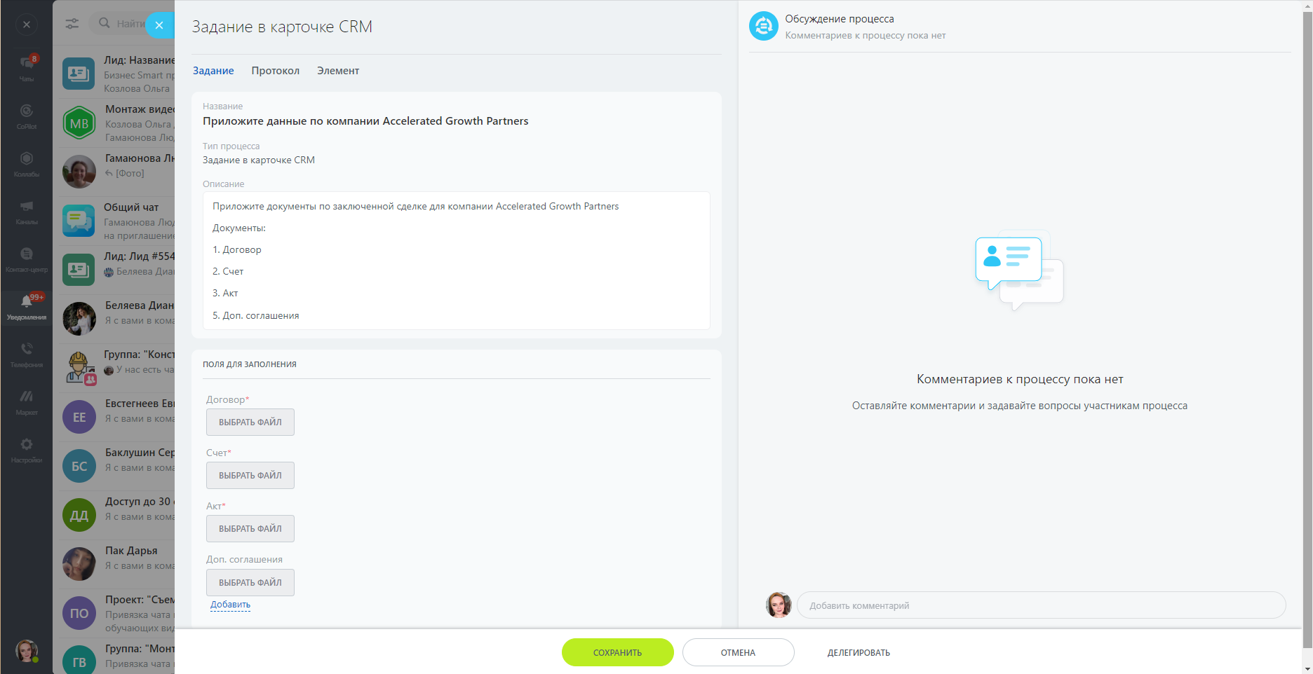 С приложением, сотрудник выполняет все задания прямо в карточке, в которой ведётся работа: лид, сделка, контакт, компания или смарт-процесс* (задание выполняется в специальном слайдере).