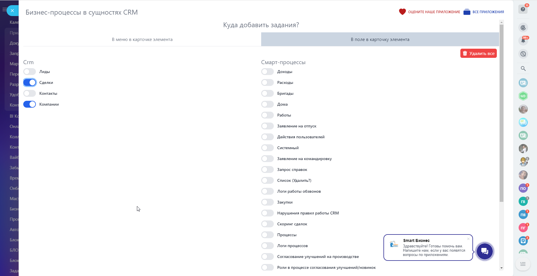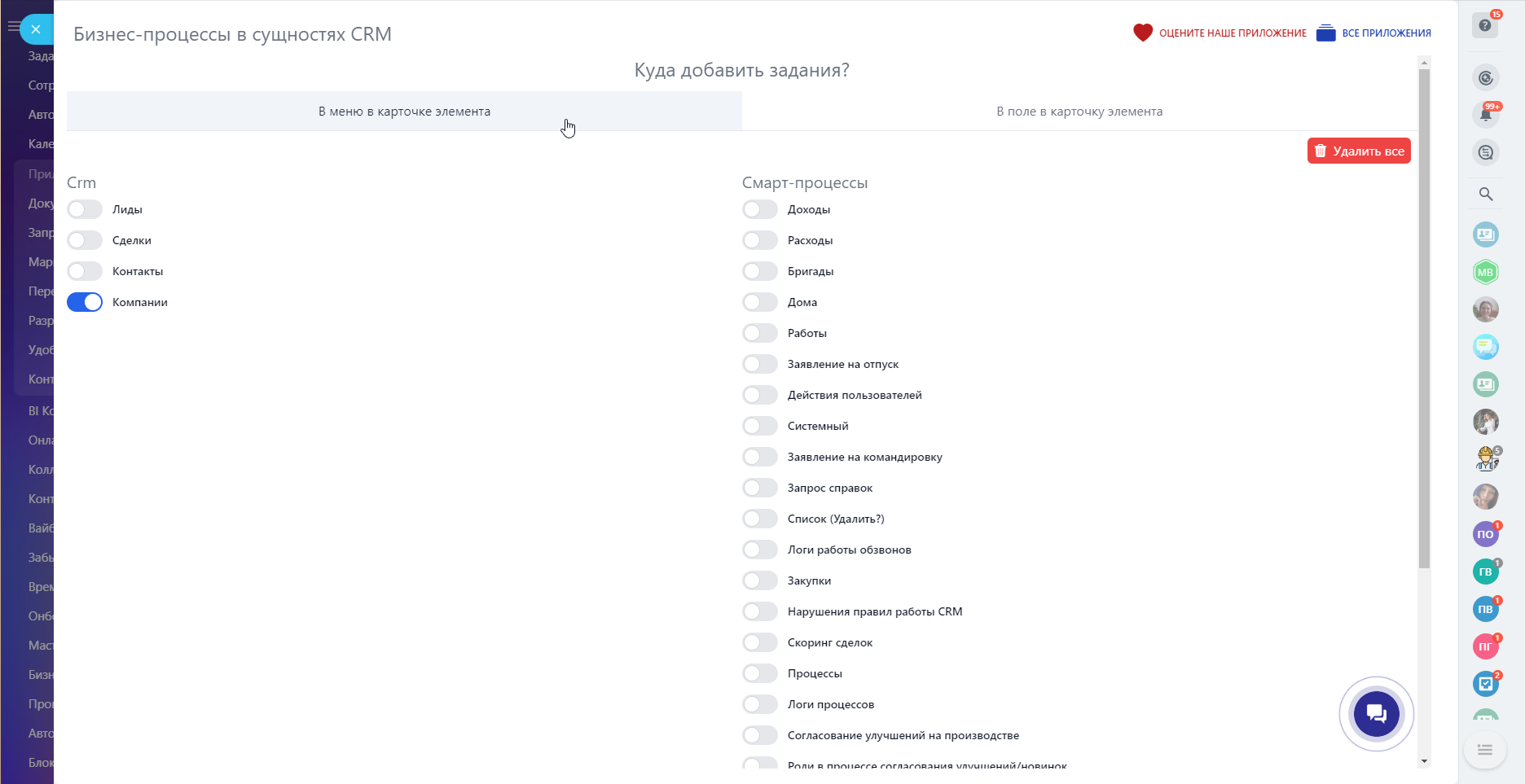 Приложение Бизнес-процессы в сущностях CRM помогает выполнять задания бизнес-процессов прямо в карточке CRM. Выберите в какую сущность встроить задания процессов: в меню или поле карточки.