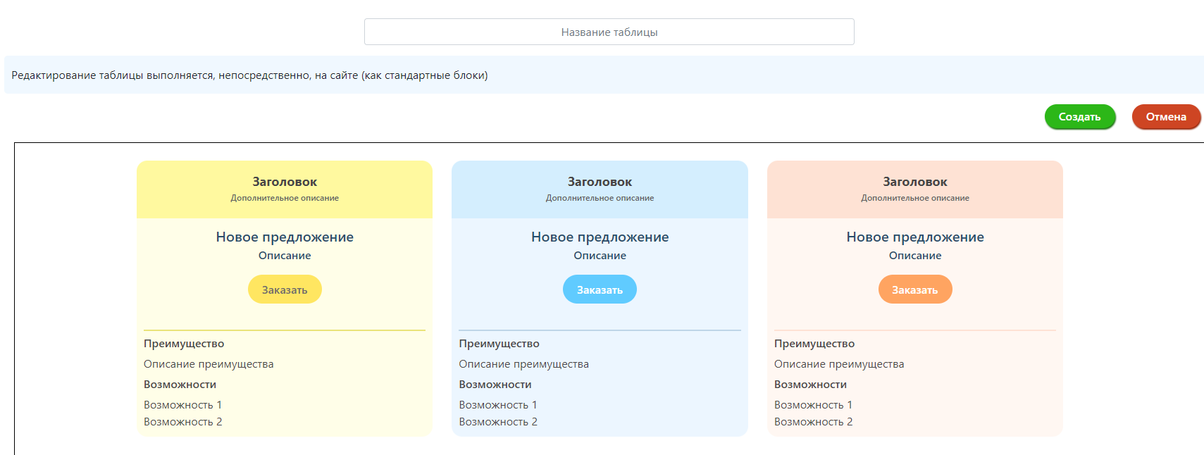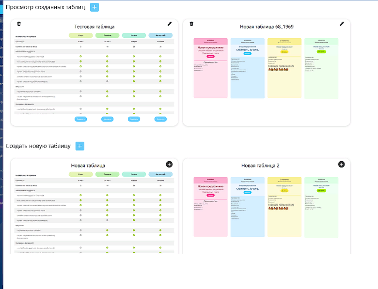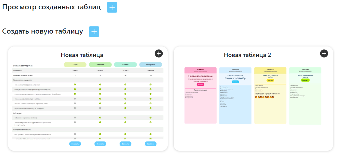 2. Сохранение созданных шаблонов: таблицы сохраняются в приложении и могут быть использованы в разных лендингах.