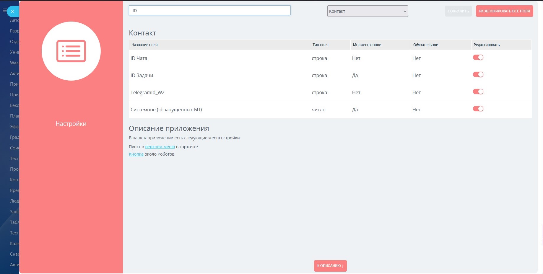 Доступ к редактированию приложения имеют только Администраторы вашего Битрикс24. Заблокированные поля не могут быть изменены пользователями.