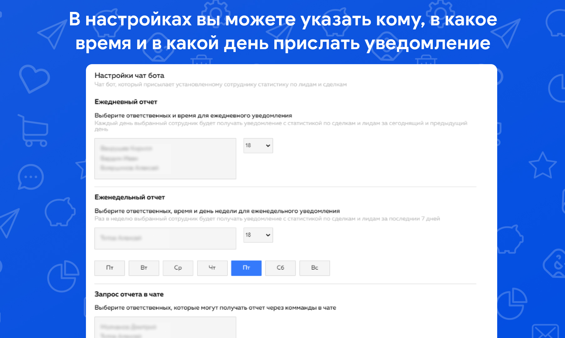 В настройках вы можете указать кому и в какое время прислать ежедневные и еженедельные отчеты, также вы можете указать, кто может запрашивать статистику в чате через команды /today и /week