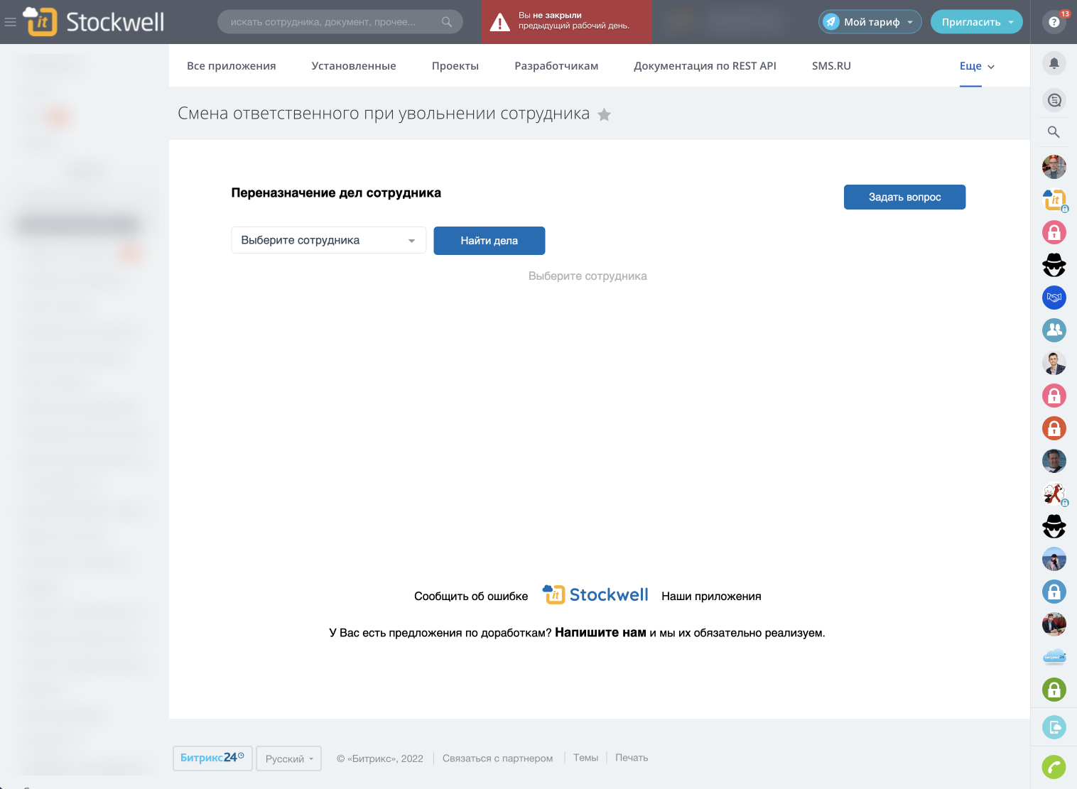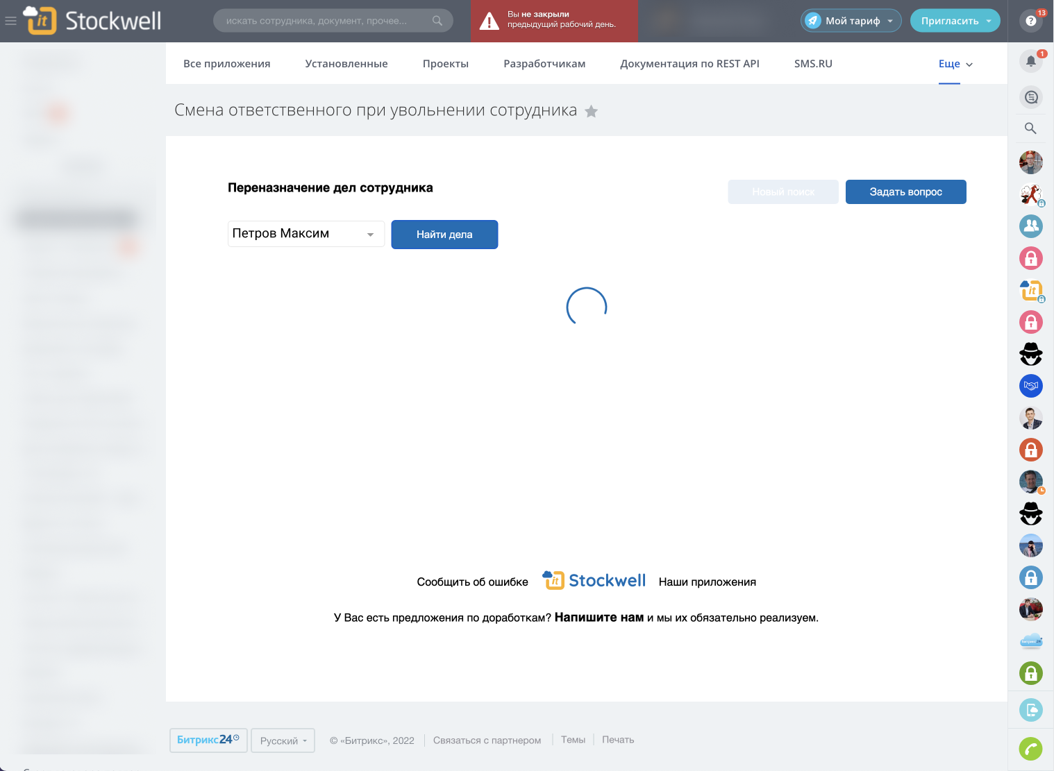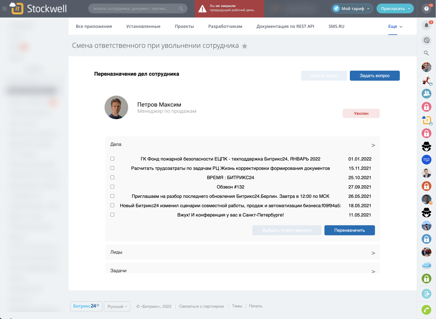 После того, как вы установили приложение из Битрикс24.Маркет, вам нужно будет зайти в установленное приложение, выбрать сотрудника и назначить лидам, контактам, сделкам и компаниям другого ответственного.
