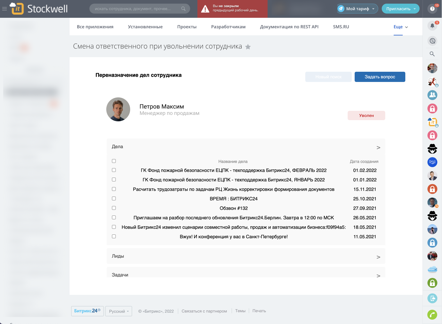 При увольнении сотрудника возникает необходимость перевести все дела на другого сотрудника. Наше приложение позволяет быстро и без проблем сменить ответственного за сделки, лиды, компании и контакты.