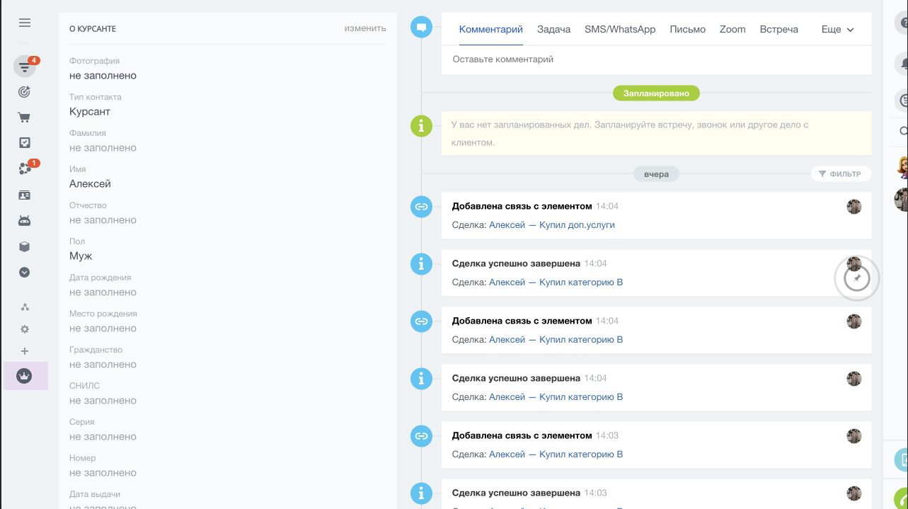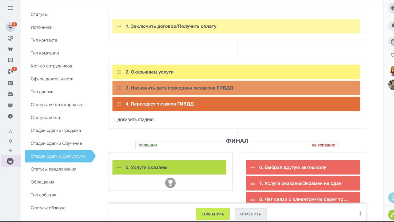 - Услуги оказаны/экзамен не сдан (на этой стадии менеджер определяет, нужно ли направлять клиента на пересдачу. если нужно, то создается копия сделки в воронке продаж для продажи пересдачи, если не нужно, то сделка в воронке обучения закрывается)