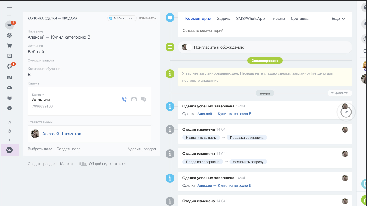 - Продажа осуществлена (на этой стадии менеджер определяет что приобрел клиент, обучение или дополнительную услугу и в зависимости от выбора менеджера сделка создается в нужном направлении автоматически)