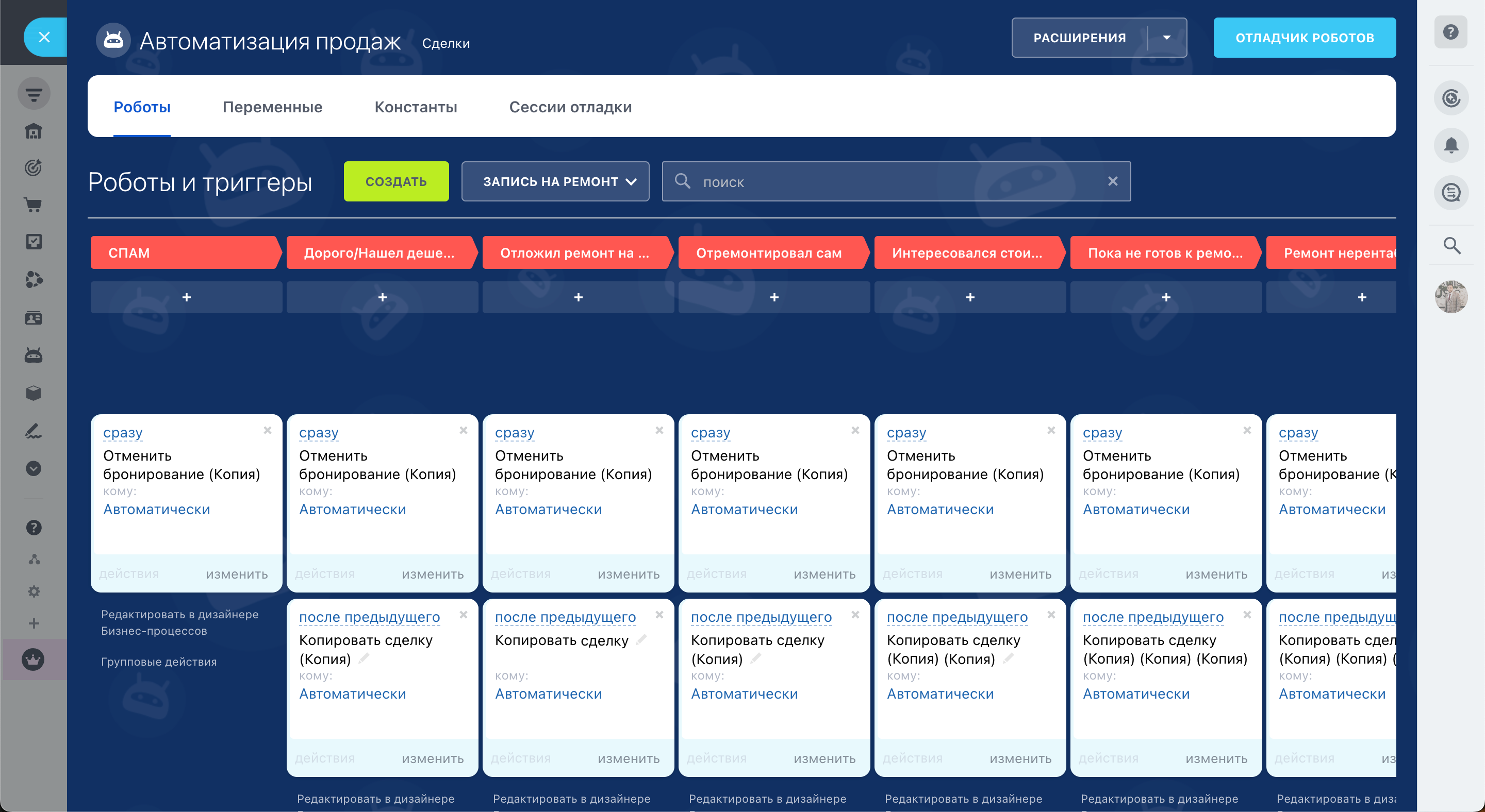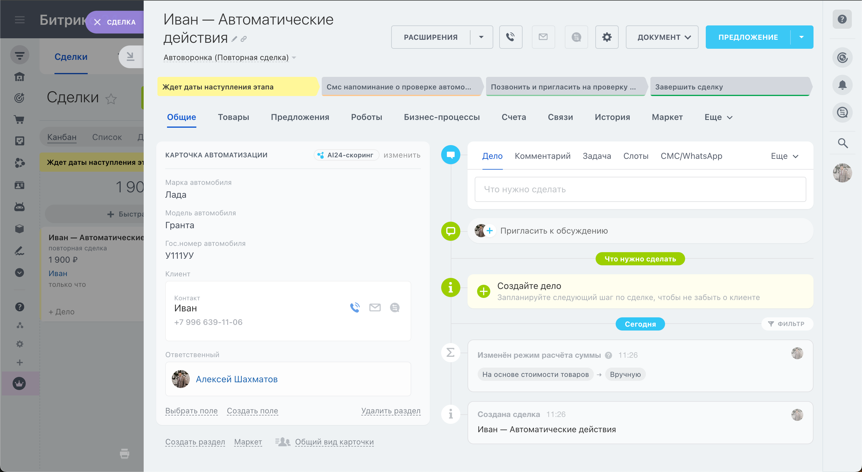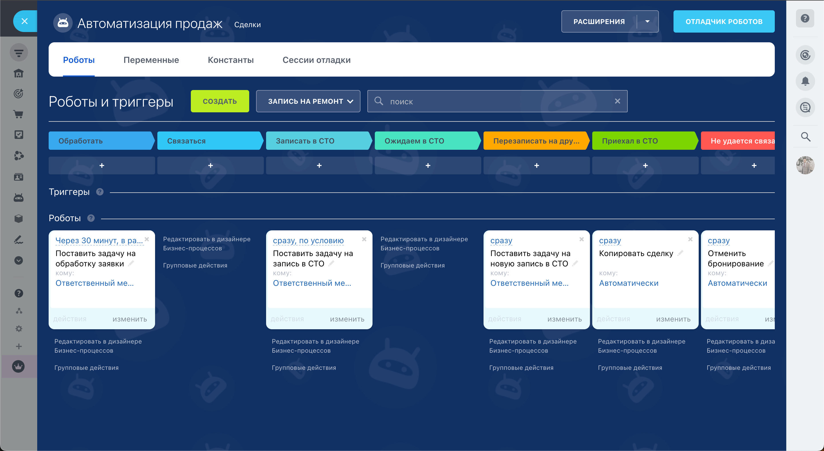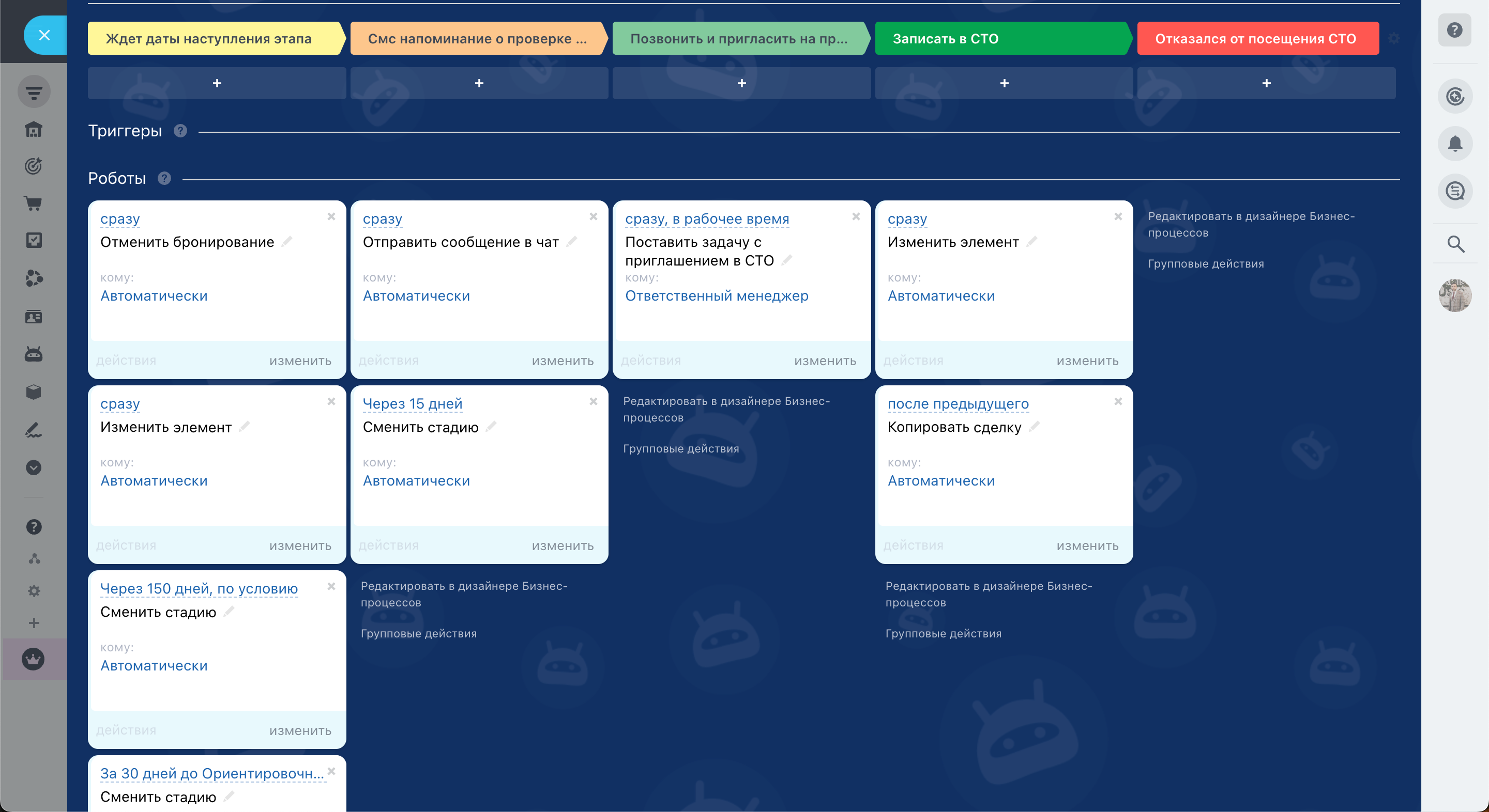 С помощью нашего решения вы сможете взять под контроль процесс продажи и оказания услуг для своих клиентов. Мы разработали воронку продаж и воронку автоматических уведомлений. С помощью этого функционала вы возьмете под контроль весь входящий трафик и сможете эффективно с ним работать. Воронка с автоматическими напоминаниями разгрузит работу менеджера, а также напомнит клиенту о предстоящей проверке автомобиля.