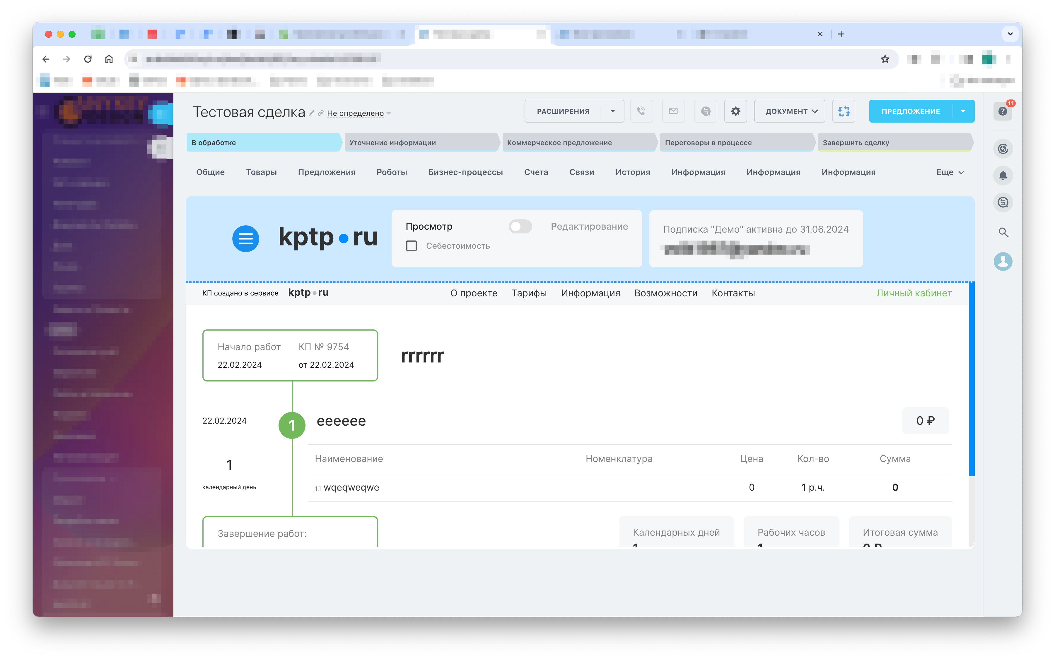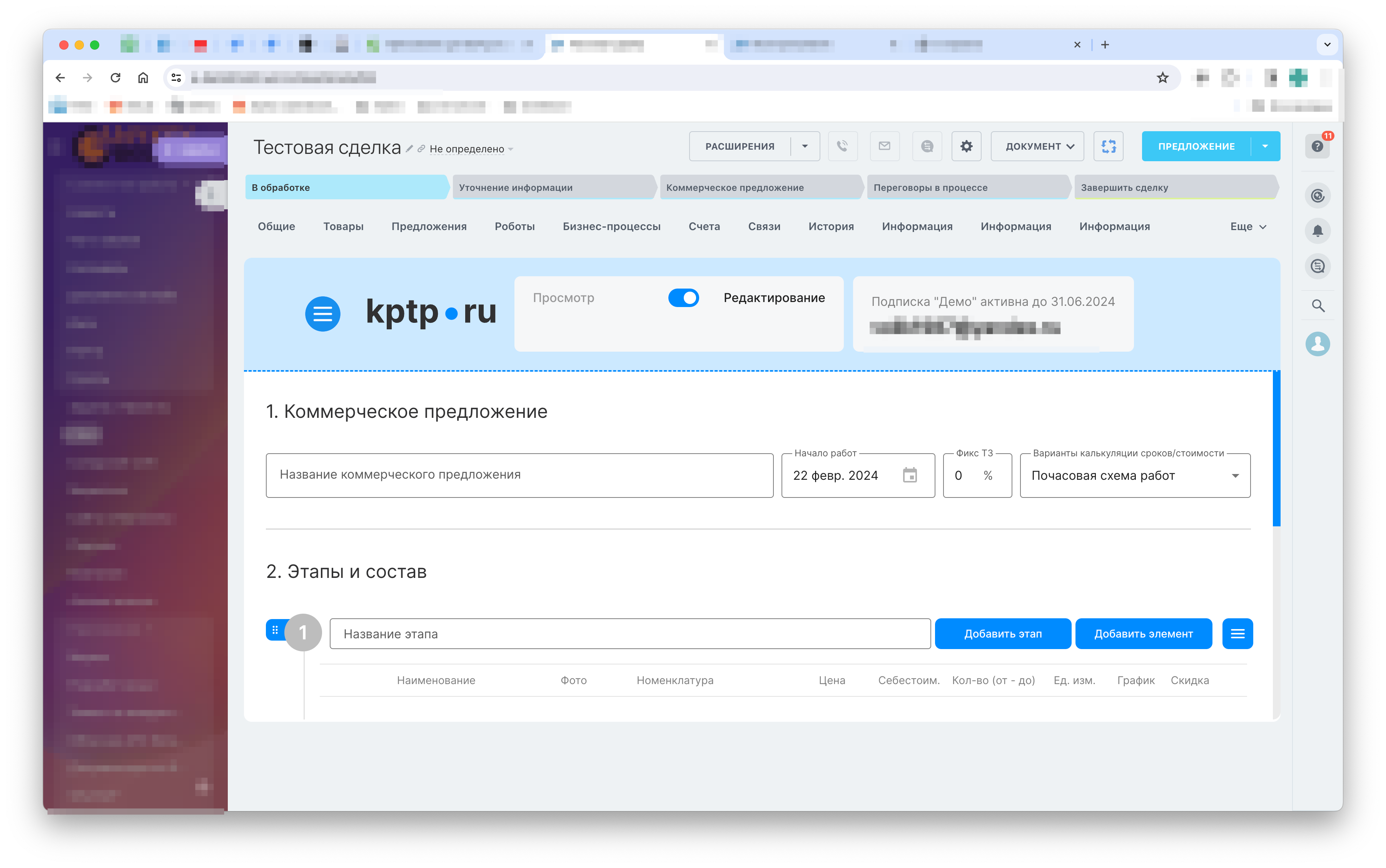 Сервис позволяет экономить огромное количество времени на этапе предварительного планирования проекта: в считанные минуты конструктор рассчитает уникальную смету и персональное коммерческое предложение, которое ускоряет процесс составления документов во много раз и с легкостью формировать измененные КП из ранее созданных с другими датами начала, другими материалами/ценами/исполнителями, при этом сохраняя всю историю действий и давая возможность вернуться к предыдущим вариантам! Ссылка на сервис - https://kptp.ru/ Тарифы - https://kptp.ru/price/