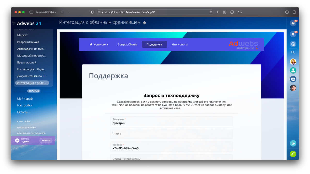 Мы оказываем техническую поддержку приложения бесплатно по будним дням с 10 до 19 (Мск).