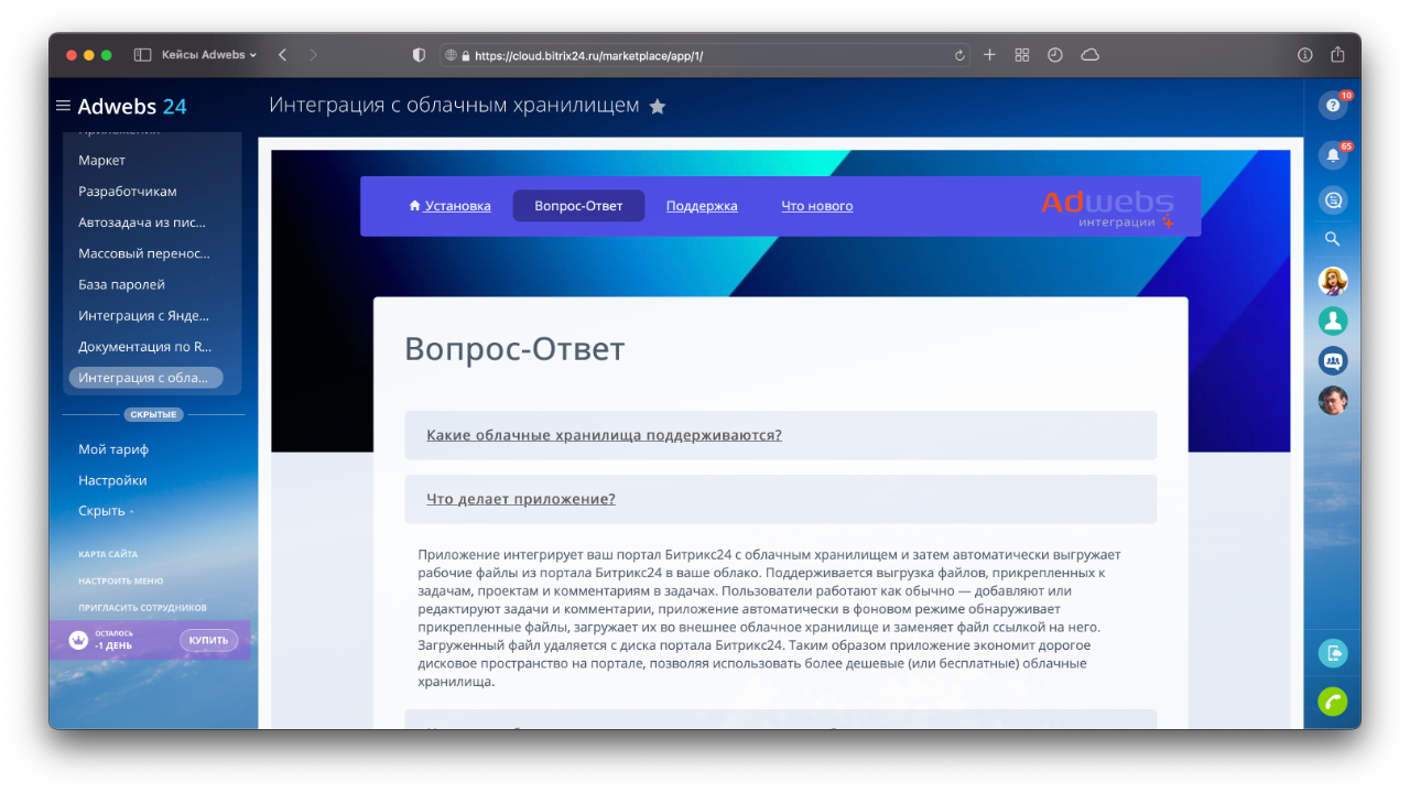 Приложение интегрирует ваш портал Битрикс24 с облачным хранилищем и затем автоматически выгружает рабочие файлы из портала Битрикс24 в ваше облако. Поддерживается выгрузка файлов, прикрепленных: