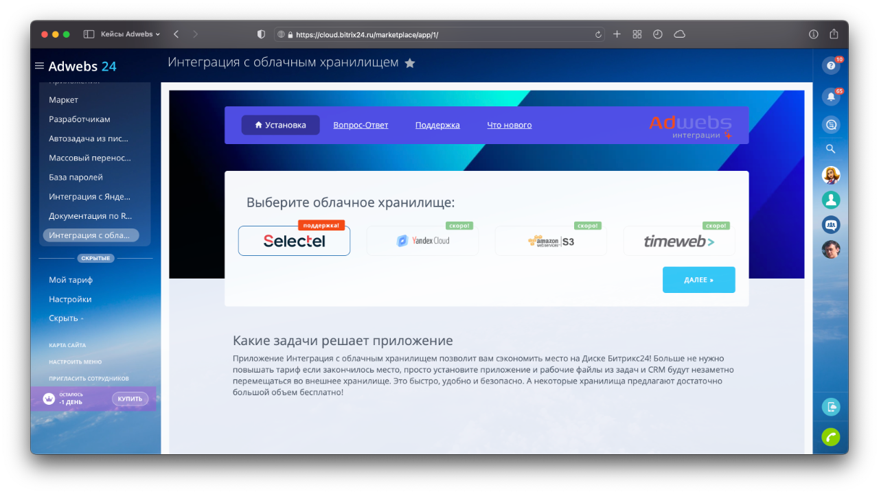 Простое и удобное приложение, которое позволит экономить дисковое пространство на портале Битрикс24, автоматически выгружая рабочие файлы в ваше облачное хранилище.