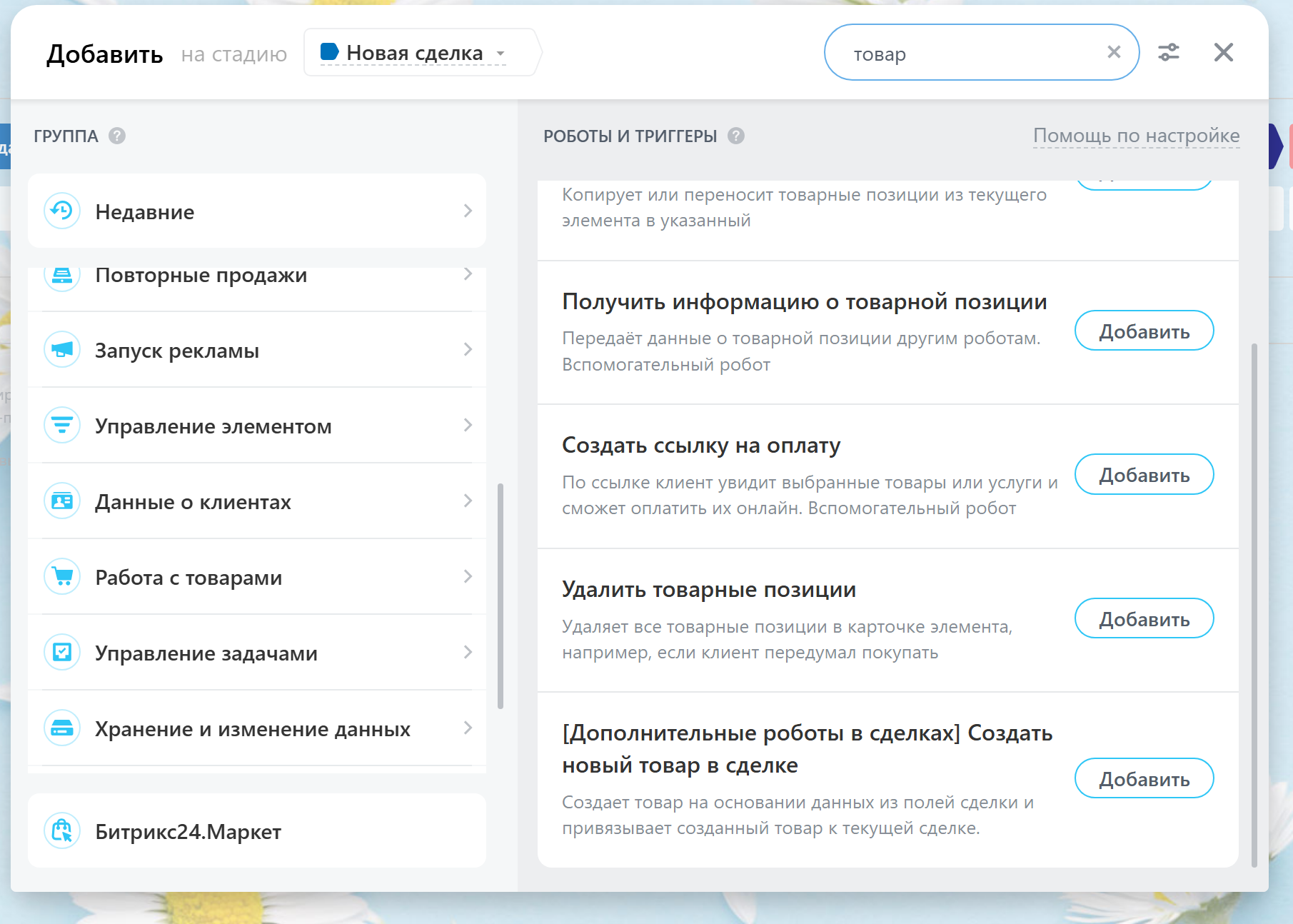 Создание товара на основании любого поля в карточке сделки, компании, либо контакта.