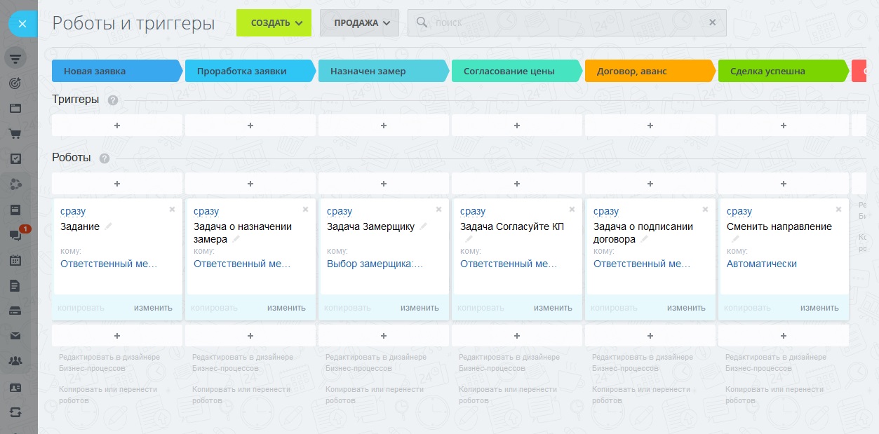 · Замер произведен - обязательно со стадии «Согласование цены» в воронке «Продажа»